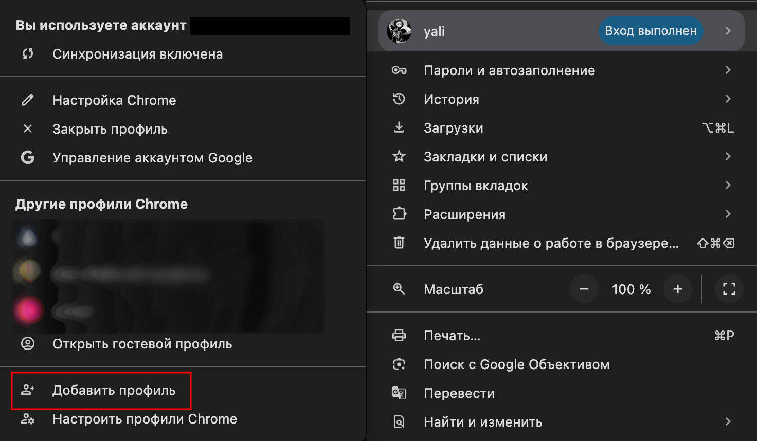Нажимаем три точки в верхнем правом углу, наводим курсор на текущий профиль и появится меню, где мы можем добавить новый профиль нажав на кнопку "Добавить профиль"