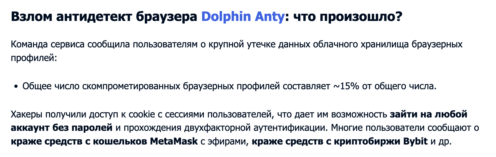 Большинство анти-детект браузеров имеют функцию облачного хранения, которое рано или поздно может быть взломано вместе со всеми вашими данными. Это уже происходило с Dolphin Anty, где произошел взлом облачного хранилища, что привело к утечке паролей и денежных средств пользователей.