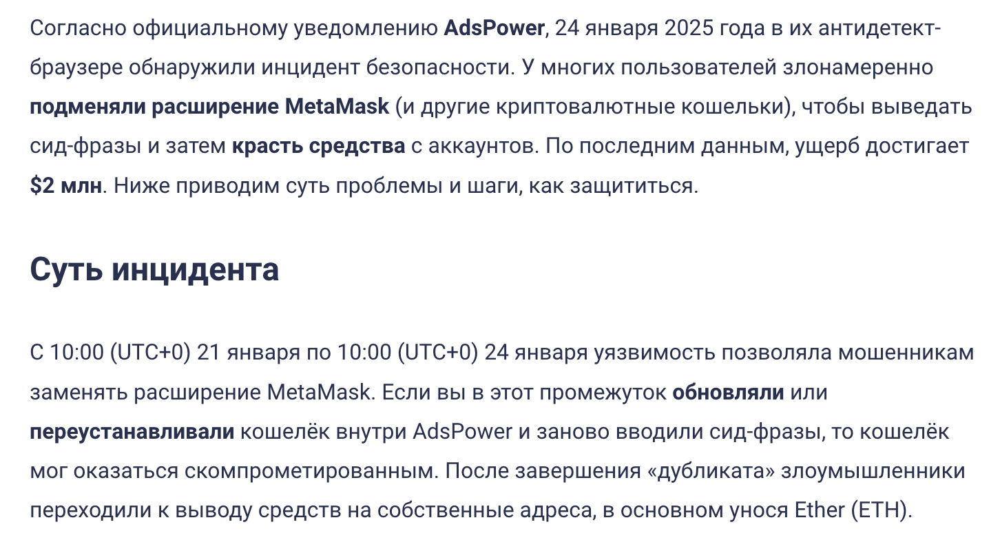 В случае с ADSPower офциальной информации о механике взлома нет (лишь расследования от энтузиастов), однако известно, что был взломан магазин расширений, в котором заменились расширения кошельков и после обновления всех расширений до новой версии, ADS подгрузил вредоносное ПО на имеющиеся профили.