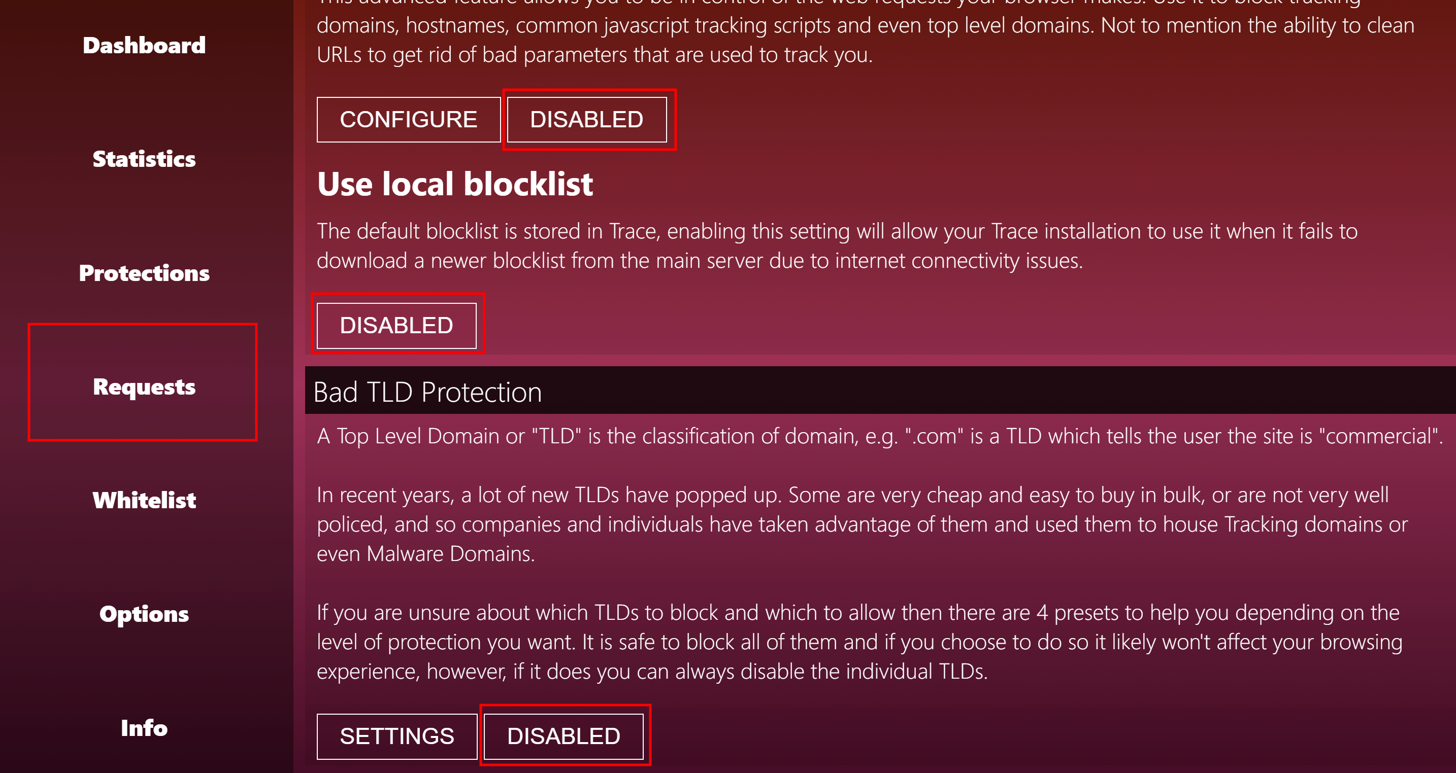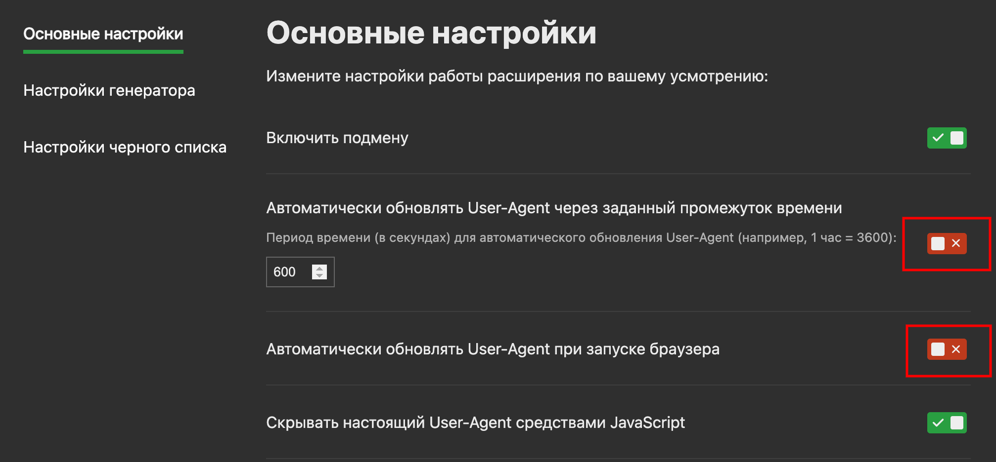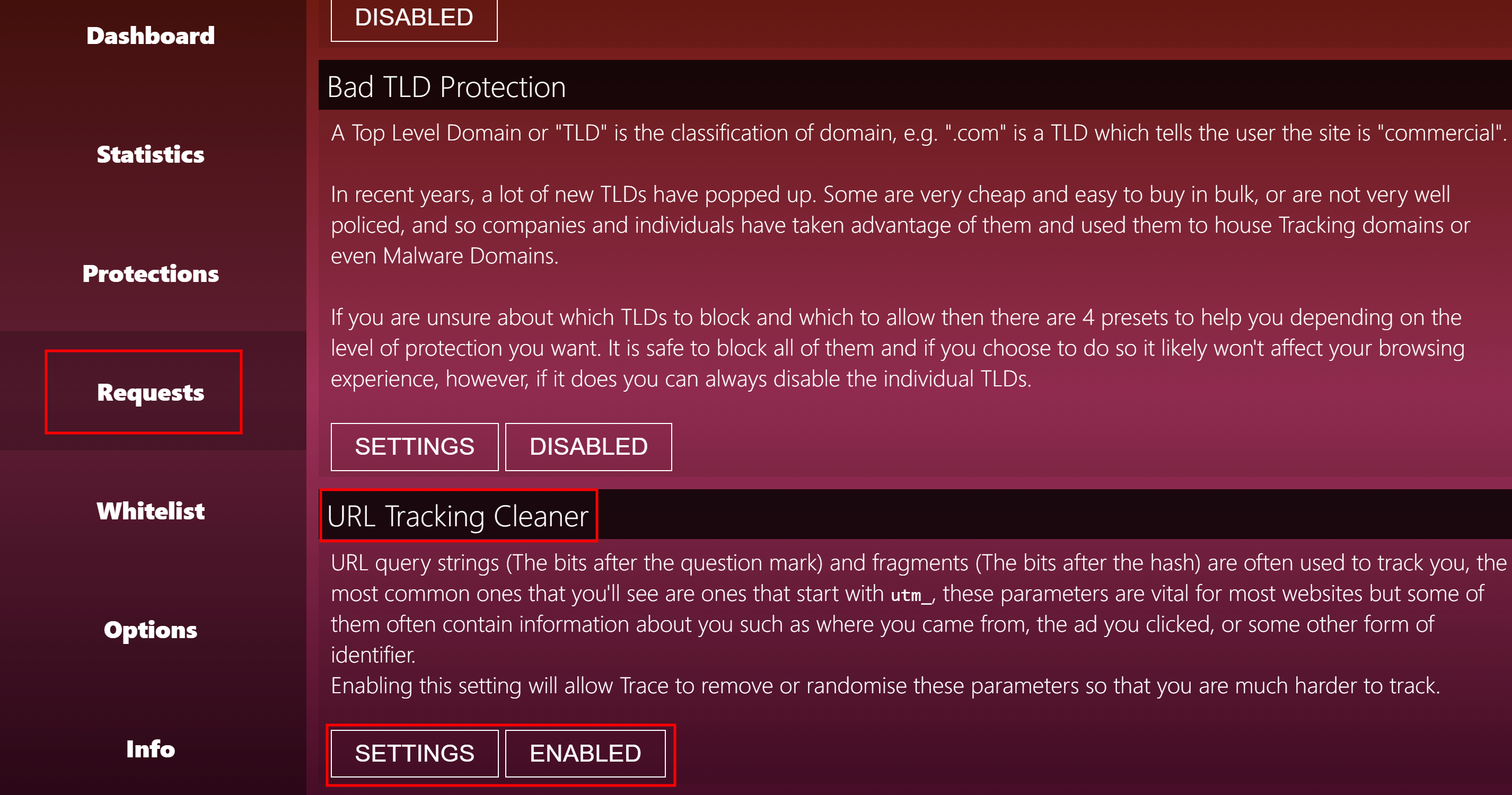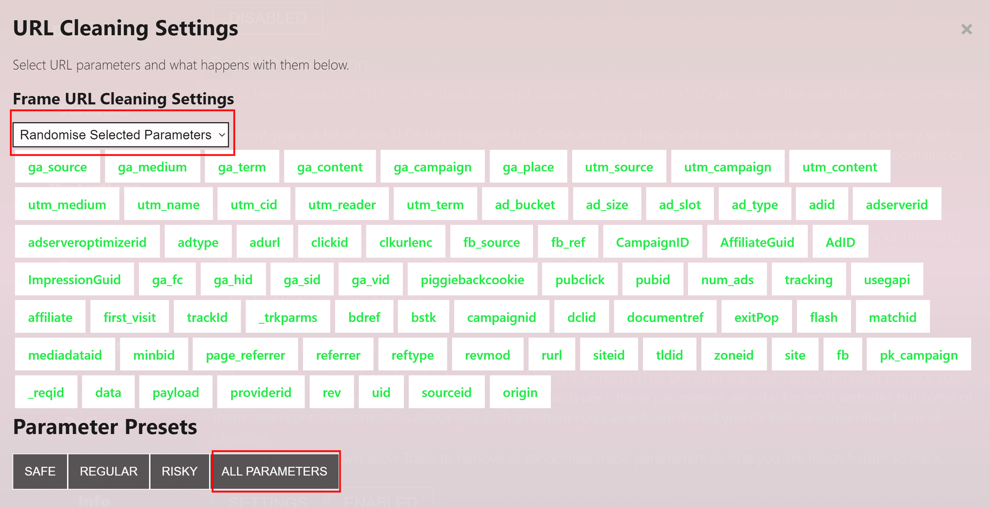 Переключаем выделенные кнопки чтобы было Disabled. Листаем вниз и видим URL Tracking Cleaner, должно быть включено Enabled