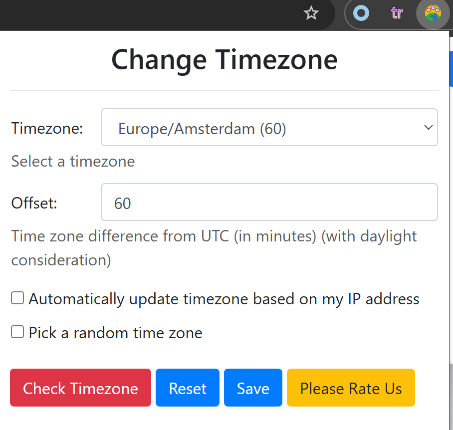 Нажимаем на расширение и выбираем таймзону вашего прокси и нажимаем Save. Таймзону прокси можно проверить в любом чекере.