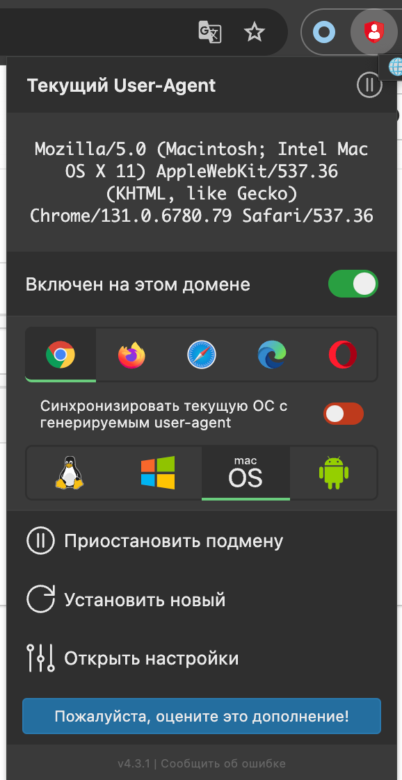 Более простой способ смены отпечатка браузера через расширение Agent Switcher