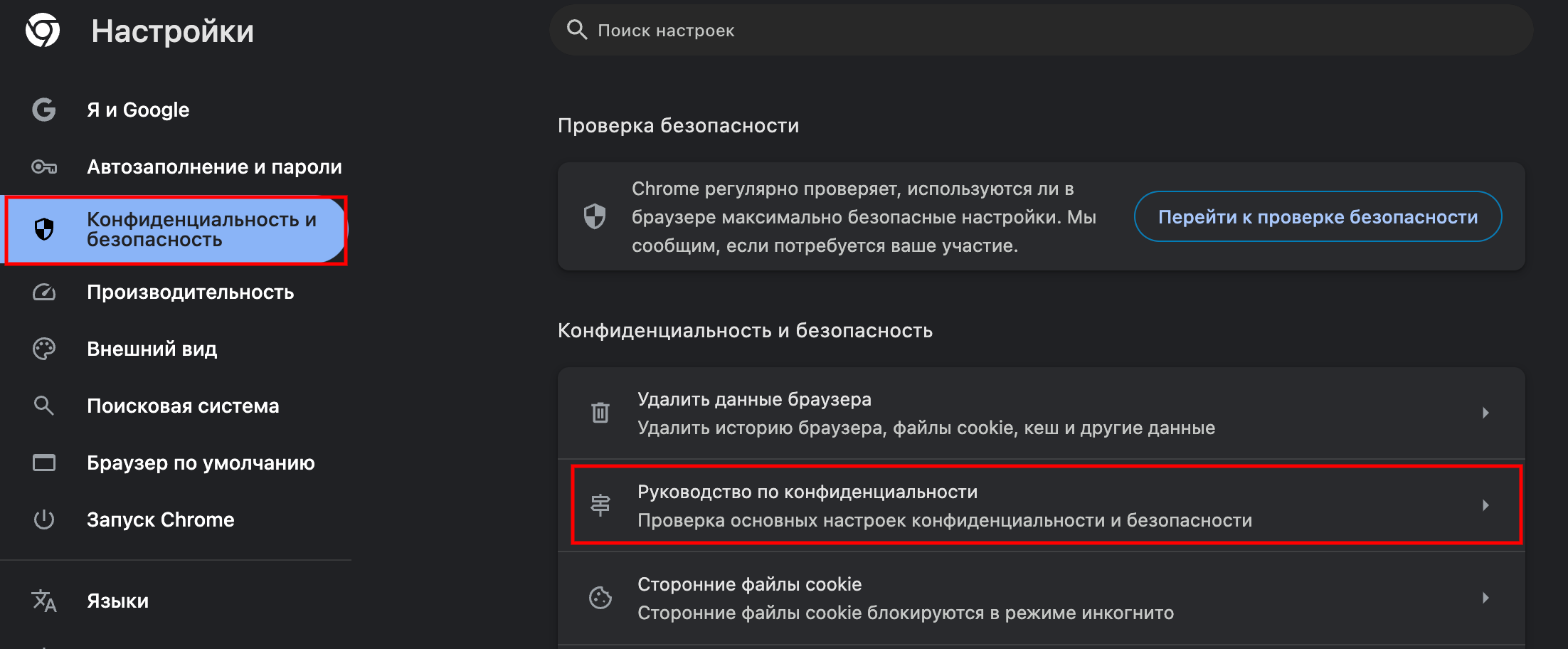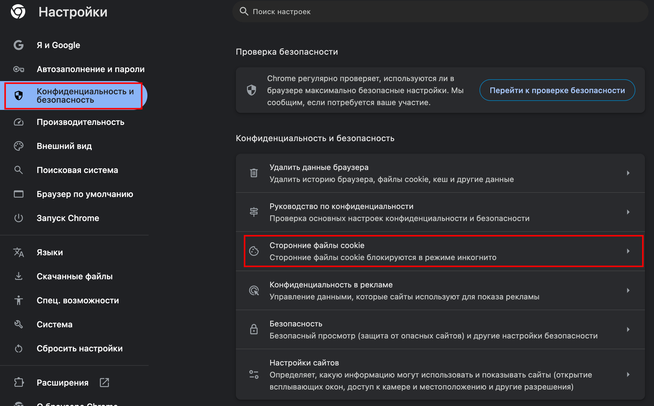 Нажимаем на вкладку "Конфиденциальность и безопасность" – "Сторонние файлы cookie"