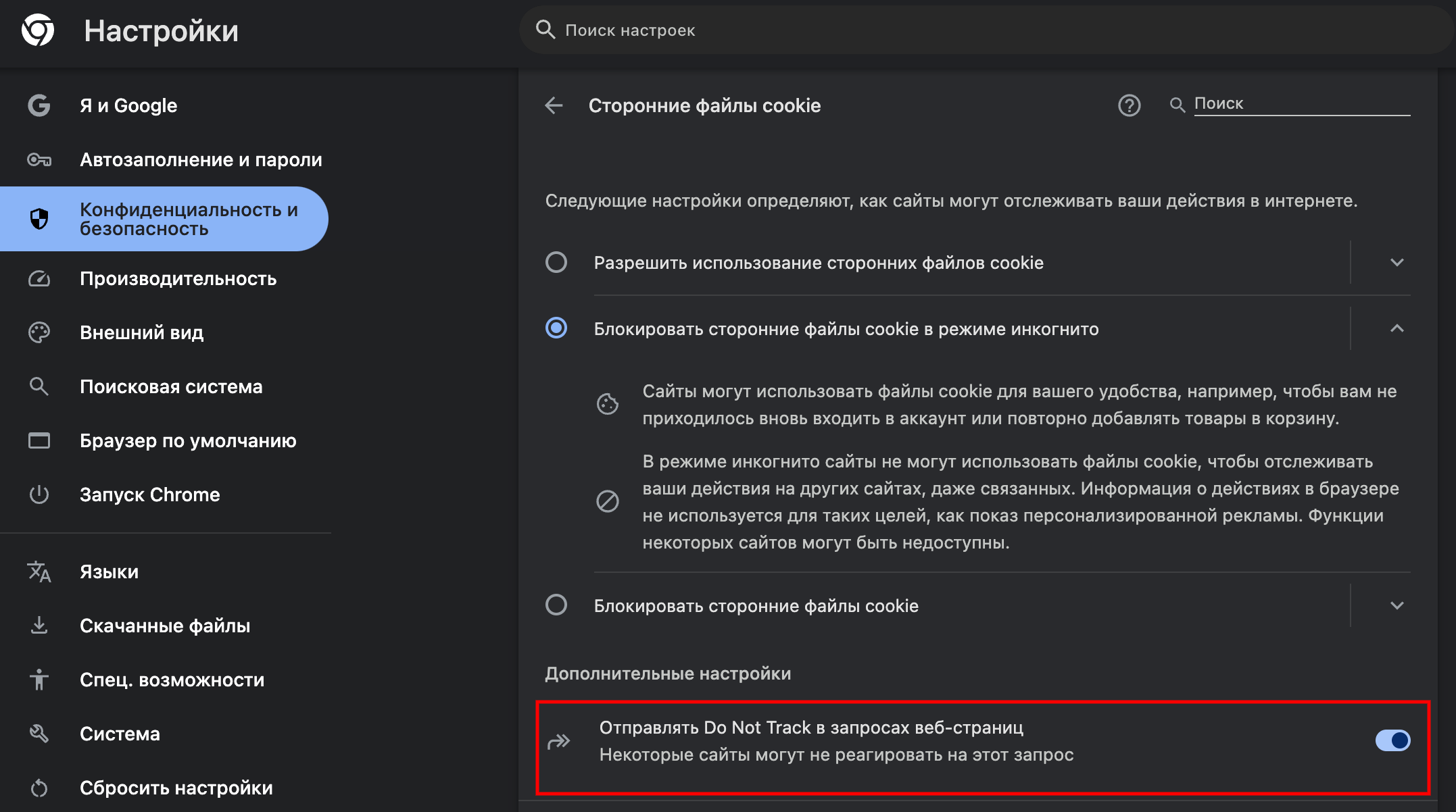Включаем тумблер "Отправлять Do Not Track в запросах веб-страниц"