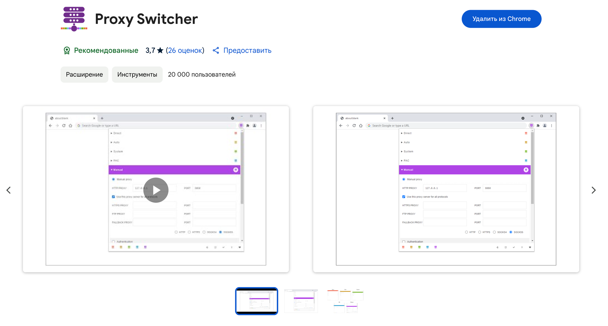 После установки открываем расширение и видим настройки прокси.