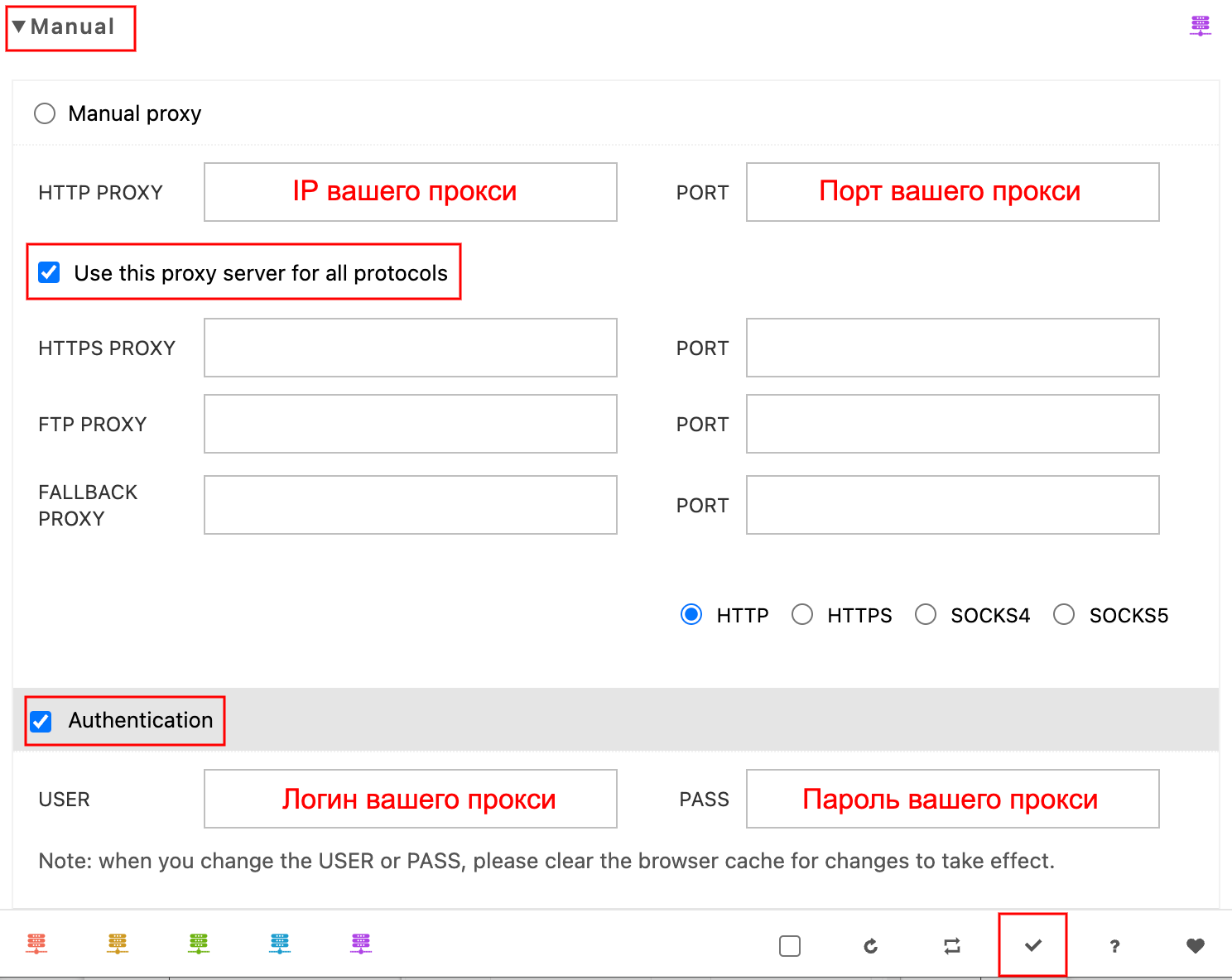 Обязательно ставим галочки Use this proxy server for all protocols и Authentication. Чтобы применить изменения – нажимаем на галочку снизу.