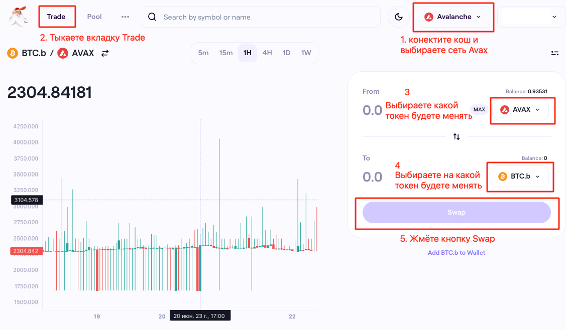 5) Когда USDC дойдут в Avalanche , залетаем на TraderJoe и закупаем там токен BTC.b на пару баксов. В качестве токена From можете выбрать либо USDC либо нативный токен AVAX (если его достаточно).