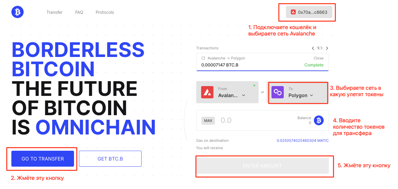 6) Затем, через мост Bitcoinbridge бриджим купленный BTC.b в сеть Polygon, а затем обязательно(!) обратно. После можете продать BTC.b в USDC либо оставить его для дальнейших прогонов по разным сетям.