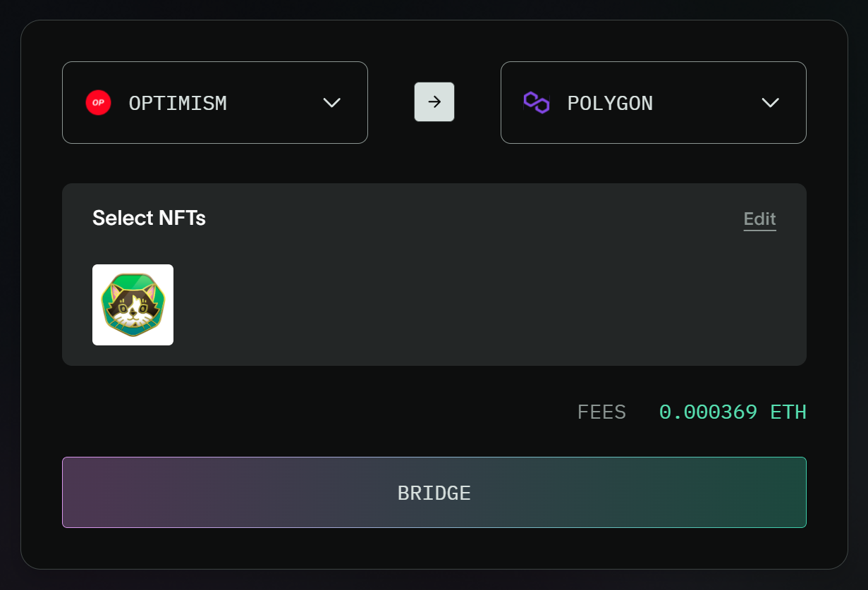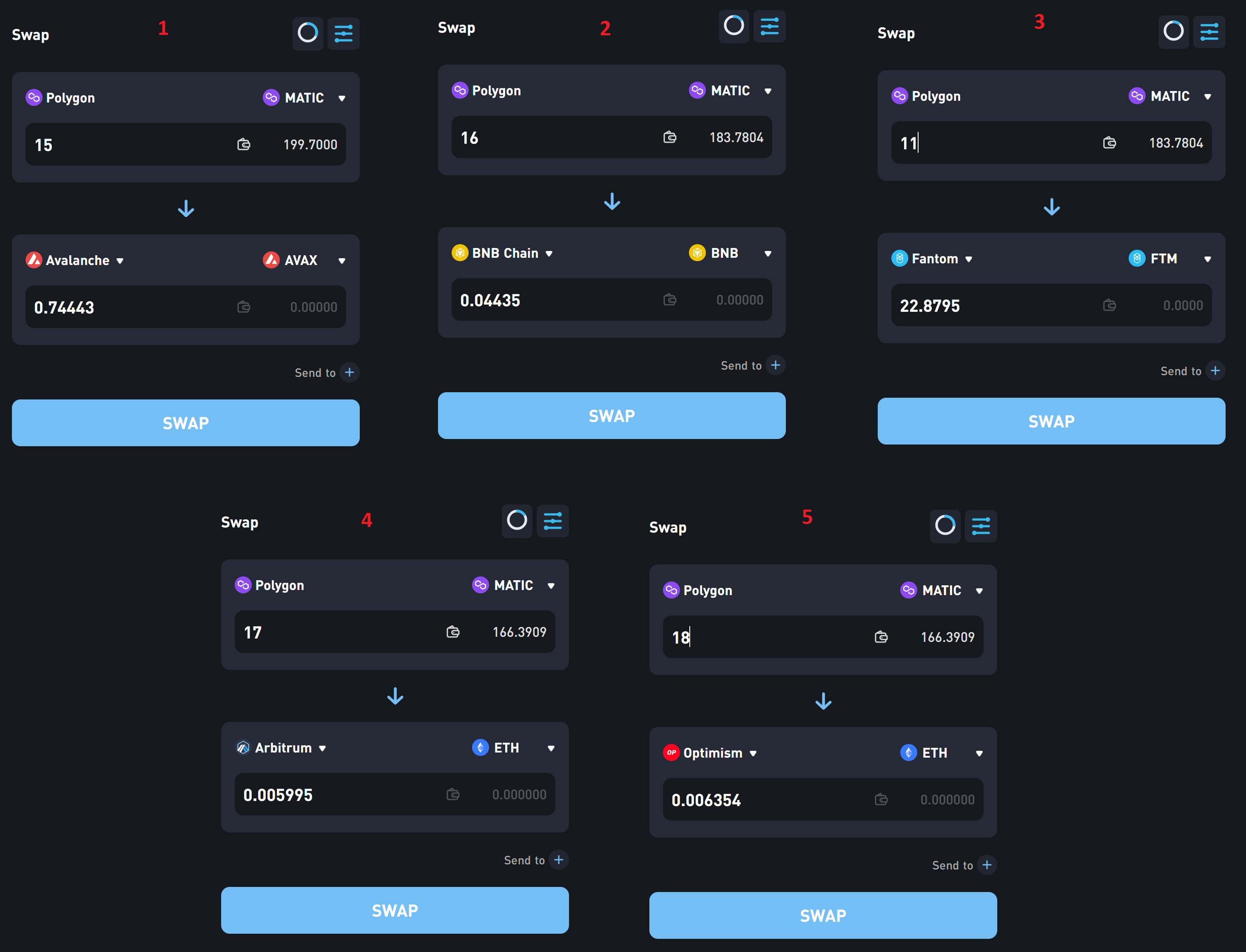 - 6 сетей отправления (Polygon/Arbitrum/Avalanche/BNB/Optimism/Fantom)
