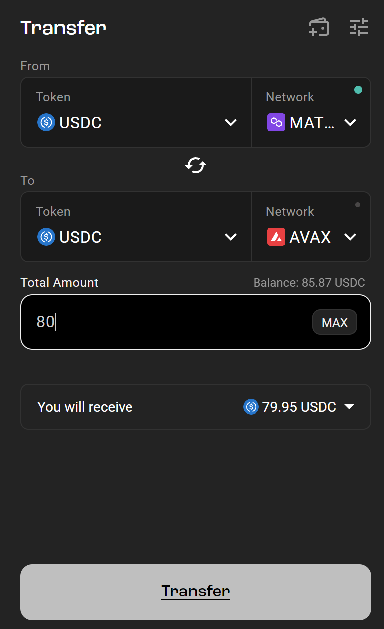 Здесь в качестве исходной сети выбираем Polygon, сети назначения - Avalanche и гоним туда наши USDC: