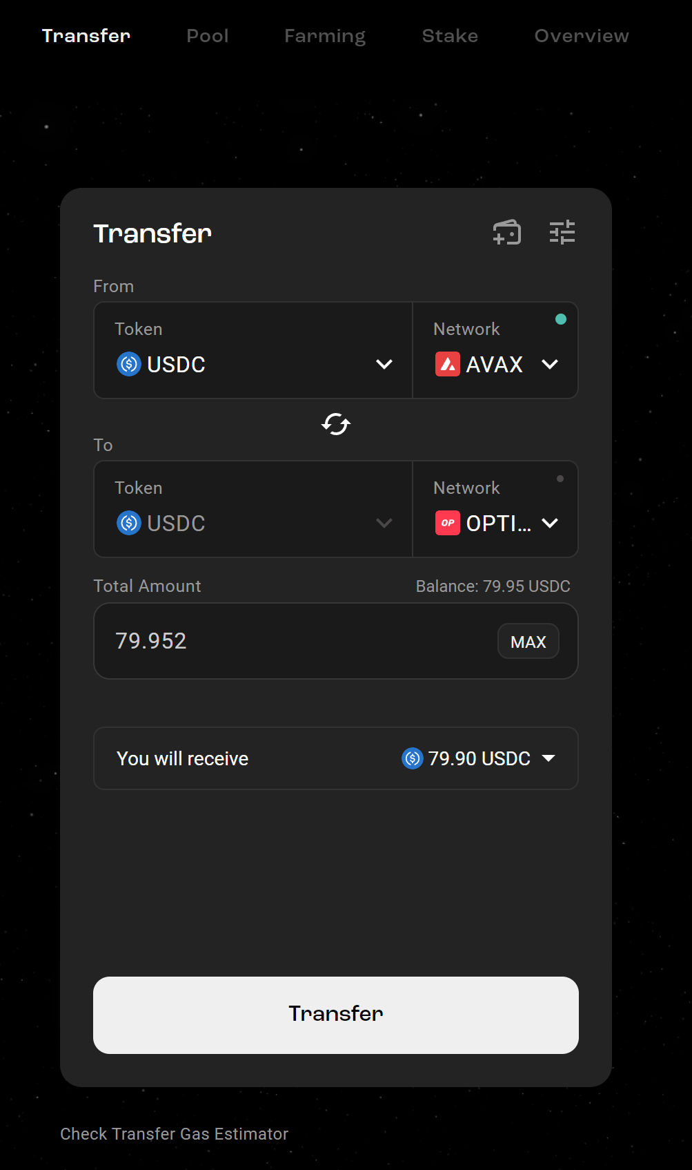 7) Далее через тот же Stargate гоним оставшиеся стейблы (USDC) из Avalanche в сеть Optimism: