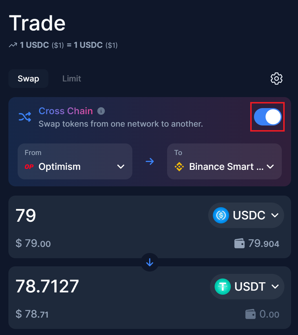 Тут включаем режим Cross Chain и перегоняем USDC из Optimism в USDT сети BNB: