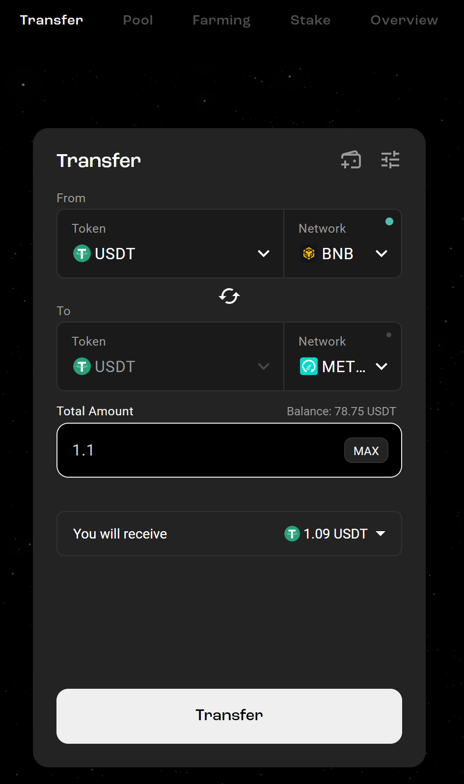 Из сети BNB мы ещё засандалим немного токенов в пару экзотических сетей. Сначала вновь идём на старгейт и отправляем чуть больше одного бакса из сети BNB в сеть Metis: