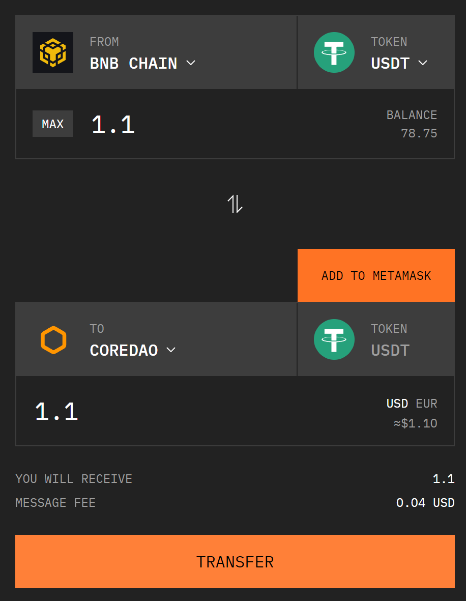 Далее прыгаем на CoreDao Bridge и аналогично пуляем туда чуть больше бакса: