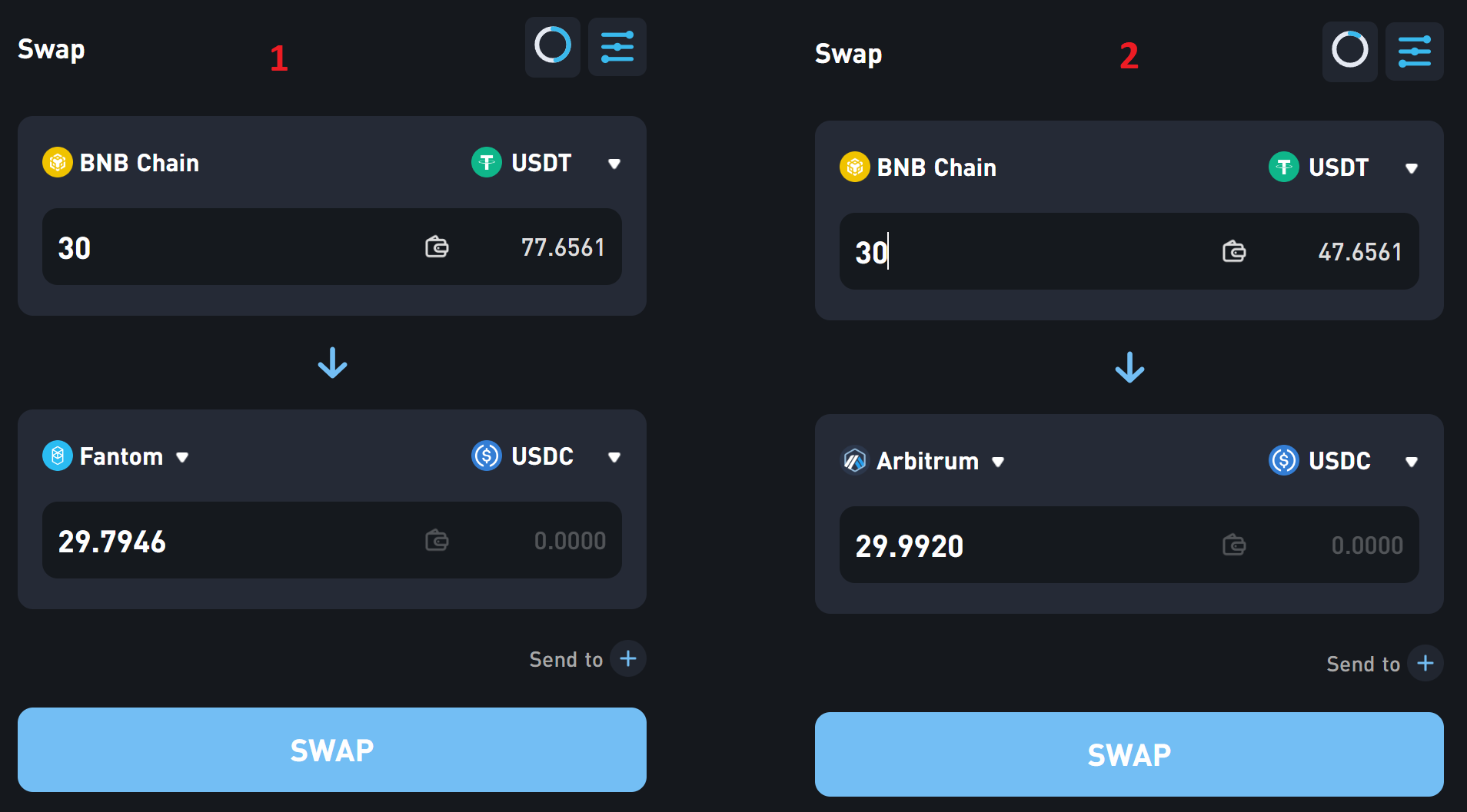 Для этого вернёмся к истокам и вновь воспользуемся WooFi, чтобы отправить половинку наших USDT в Fantom и вторую половинку в Arbitrum: