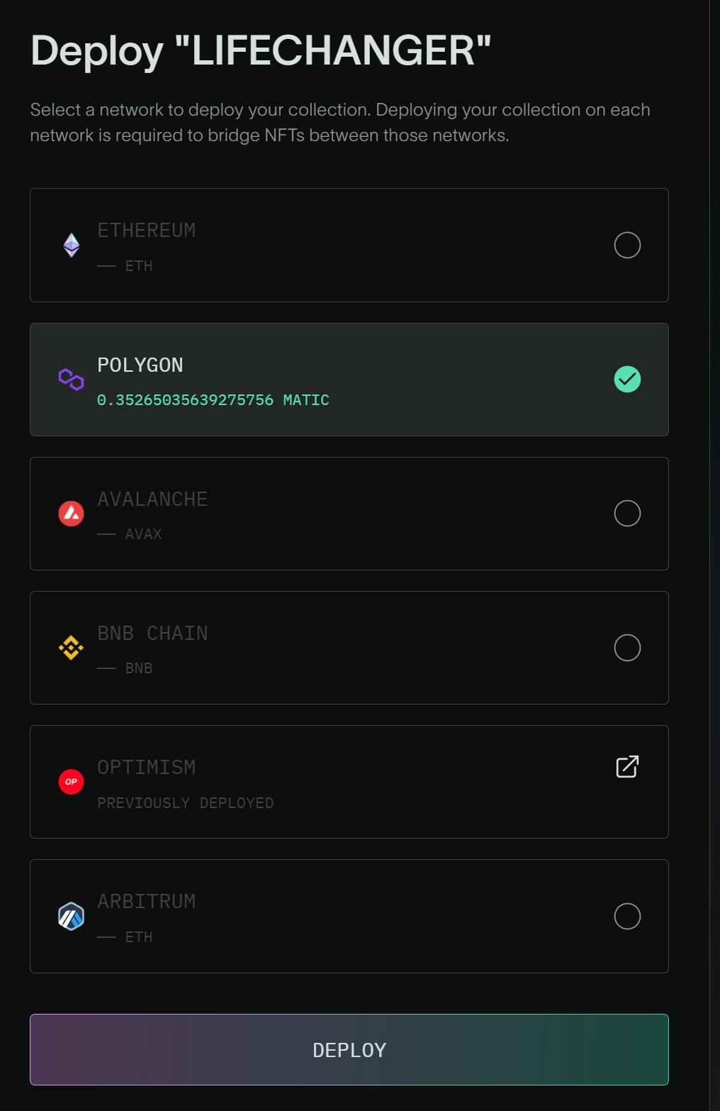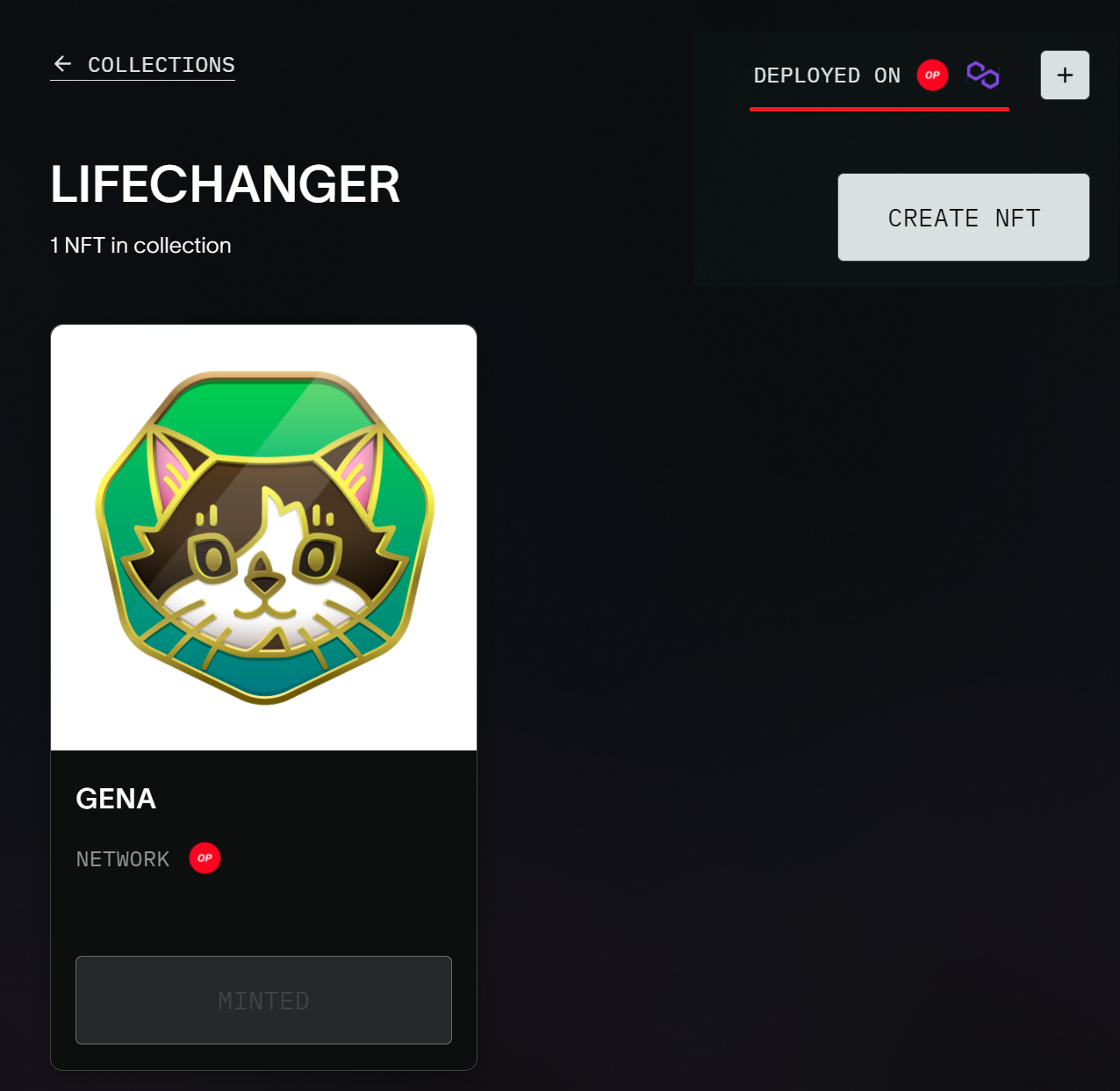 - Залетайте на сайт, подрубайте кошелёк, выбирайте сеть в которой будете тыкаться (рекомендуем Optimism и Polygon) и создавайте коллекцию. Название и тикер монеты указываете на своё усмотрение: