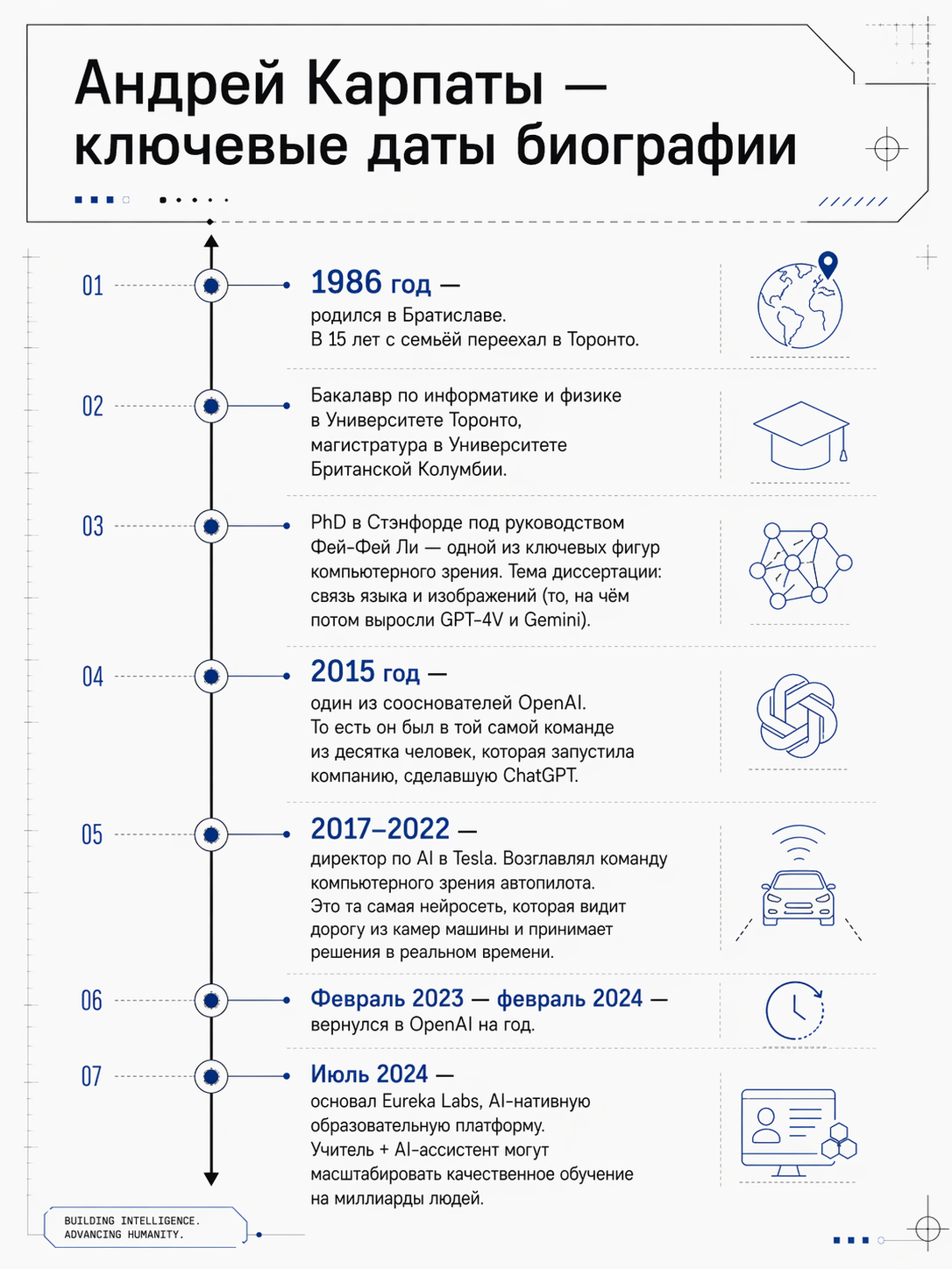 Параллельно с этим Карпаты является публичным преподавателем. Его курс Neural Networks: Zero to Hero на YouTube посмотрели миллионы. Его эссе Software 2.0 (2017 год) стало классикой, там он за пять лет до бума объяснил, почему программирование начнёт сдвигаться от написания инструкций к обучению моделей.