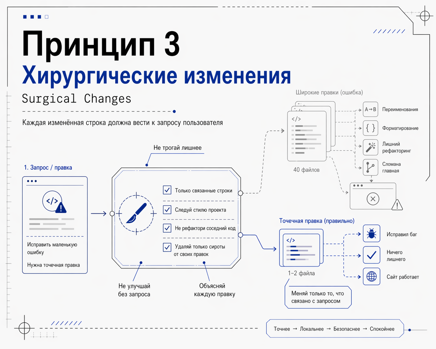 Этот принцип решает одну из самых бесящих проблем повседневной работы с агентами. Вы просите поправить одну маленькую ошибку, а в результате агент перелопатил 40 файлов в вашем проекте.