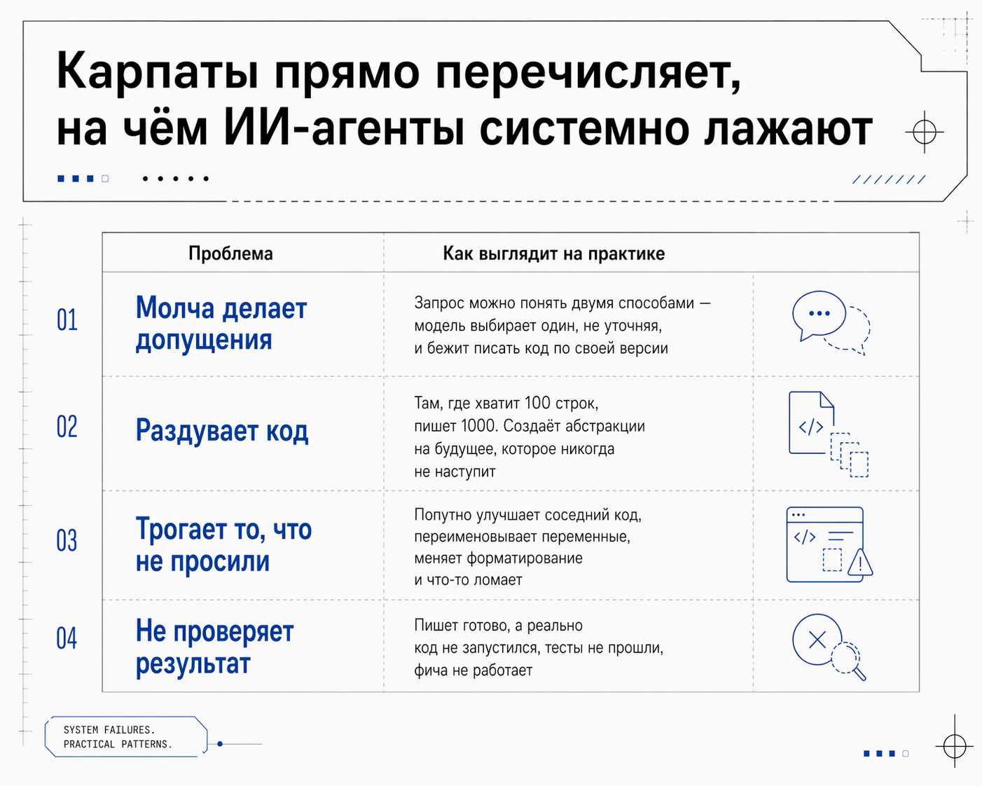 Карпаты прямо перечисляет, на чём ИИ-агенты системно лажают: