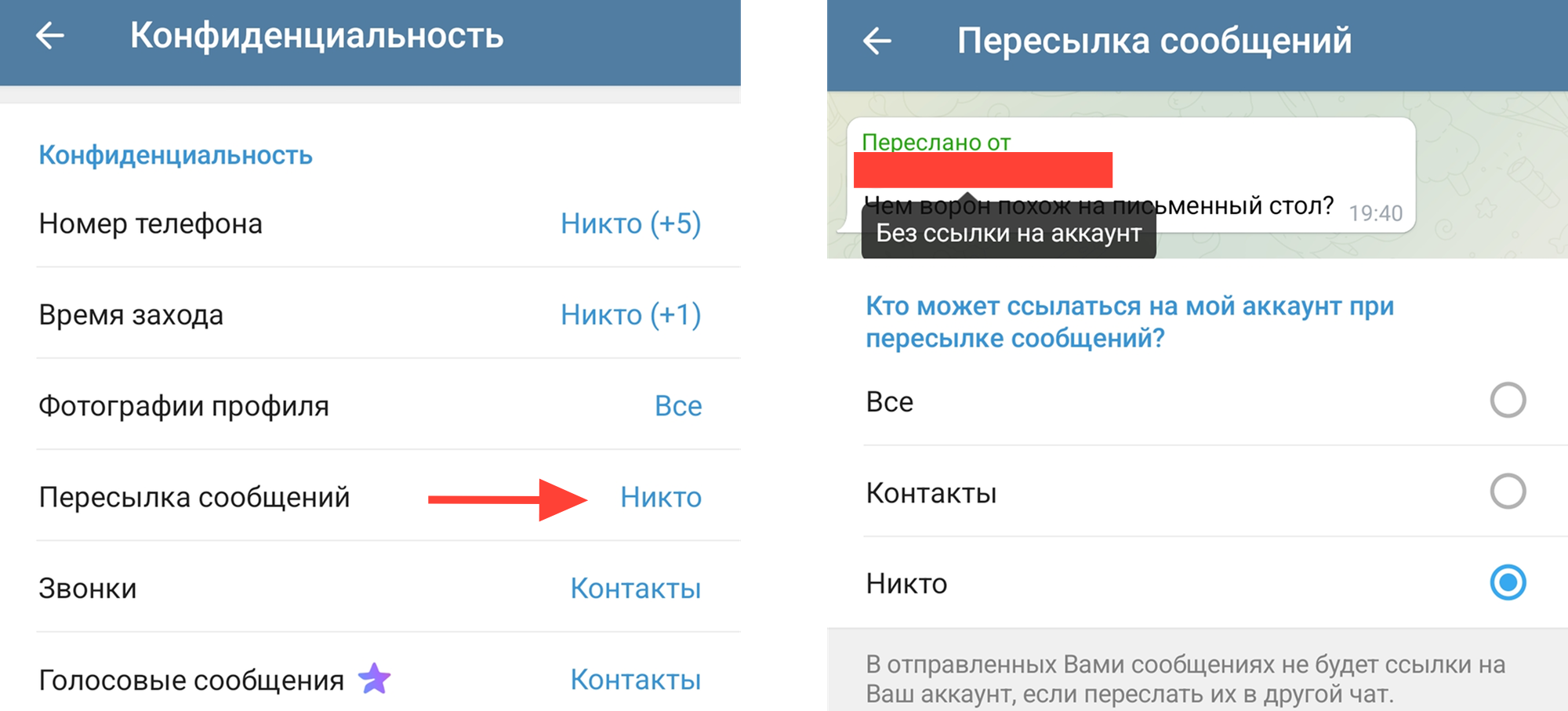 3) Скрой отображение твоего никнейма при пересылке сообщений: Конфиденциальность → Пересылка сообщений → Никто
