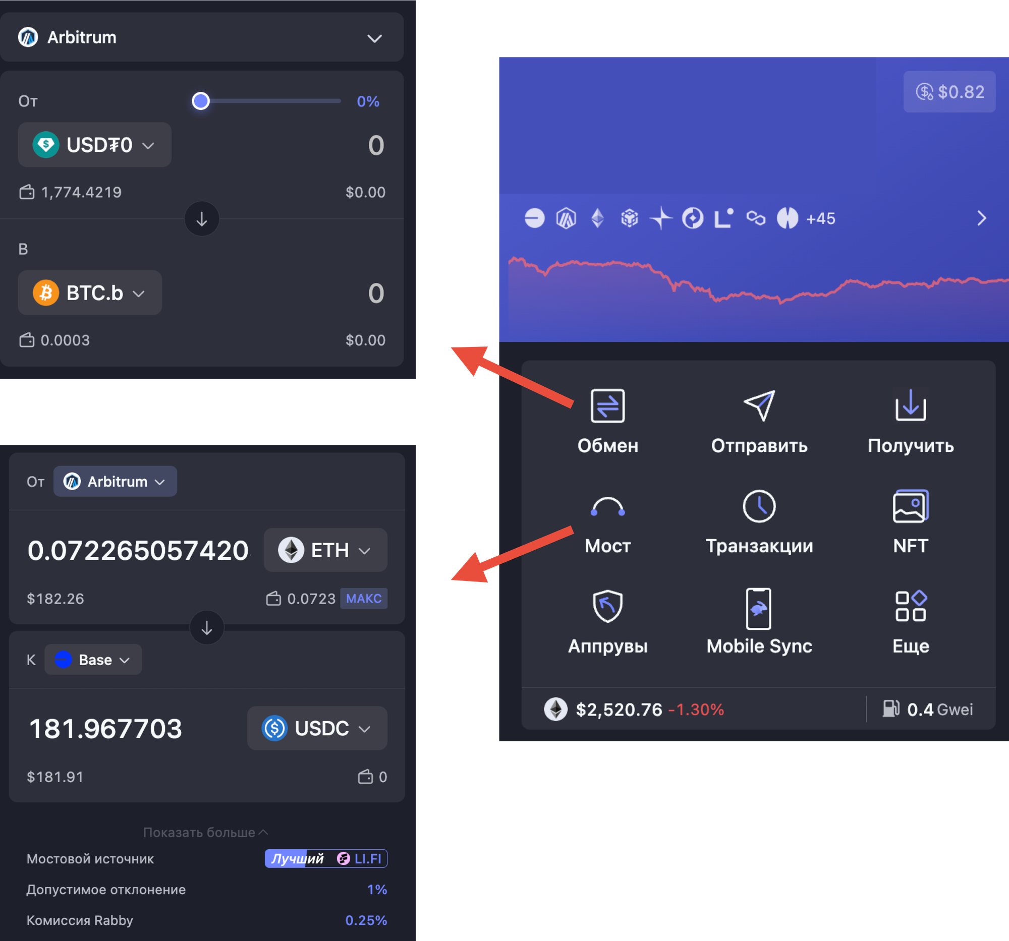 Их можно найти в основном меню кошелька по соответствующим кнопкам. Условия обмена в данных инструментах обычно менее выгодны, чем в профильных dApps, а также Rabby Wallet берёт комиссию в 0.25% за каждую сделку. При этом если дело не терпит отлагательств, то эти инструменты работают максимально быстро и эффективно.