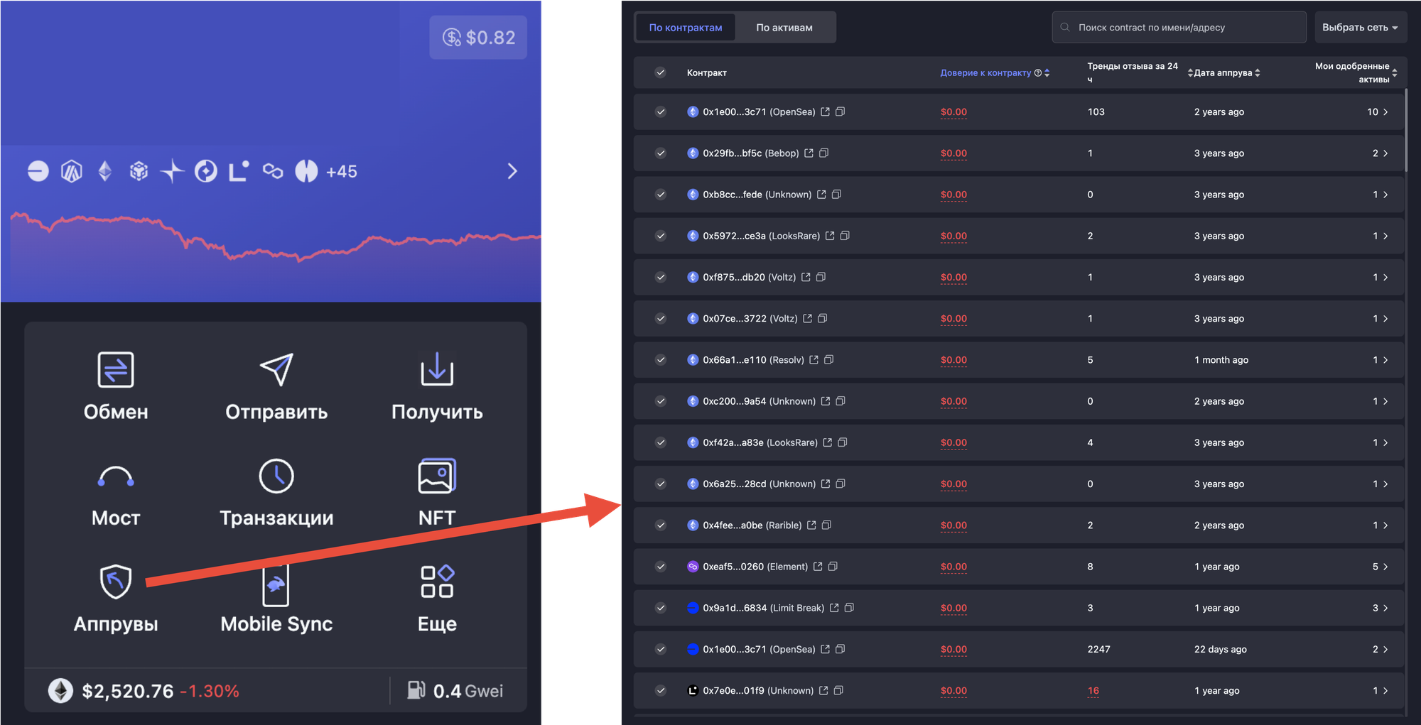 Этот инструмент можно найти также в главном меню десктопного кошелька по кнопке Аппрувы. Через него можно пакетно отменять уже розданные апрувы, экономя время и силы.