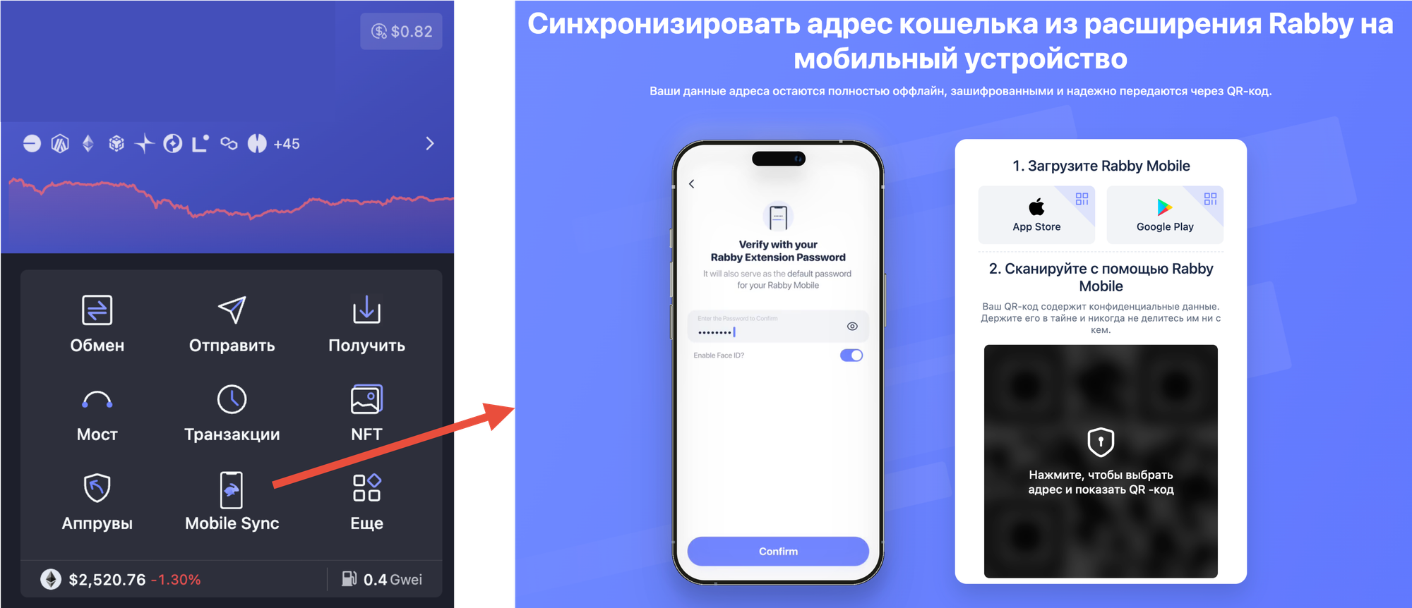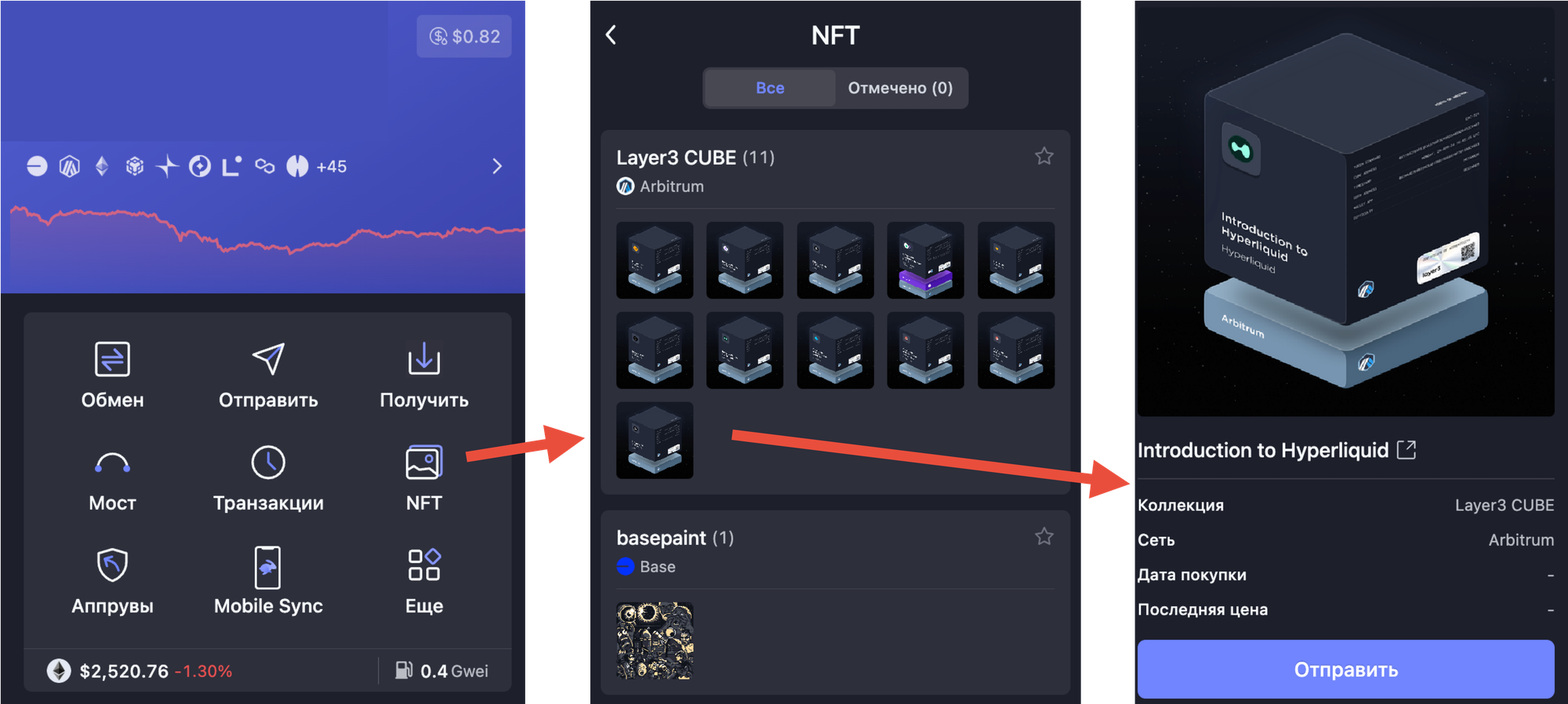 Внутри этого кошелька можно найти встроенный чекер и отзыв апрувов, мост для обмена между разными сетями, свапалку для обмена внутри одной сети, NFT галерею и синхронизацию с мобильным кошельком, чтобы не вводить в него свои приватные ключи.
