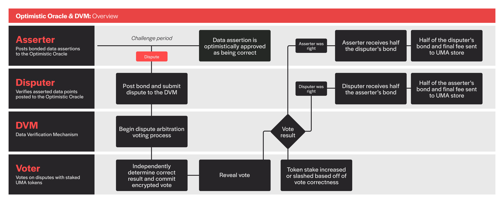 - Если кто-то подал диспут, система перезапускает проверку и в дело вступают стейкеры UMA - именно они в конечном итоге решают путем голосования, произшло событие X или нет.