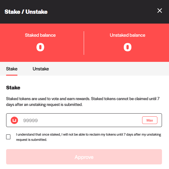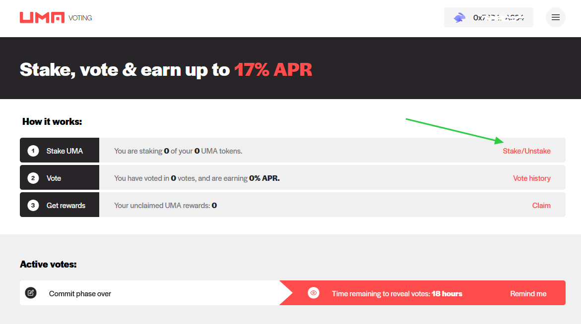 После чего перейти на сайт vote.uma.xyz, подключить кошелек и внести свои токены нажав кнопку Stake и подписать транзакцию.