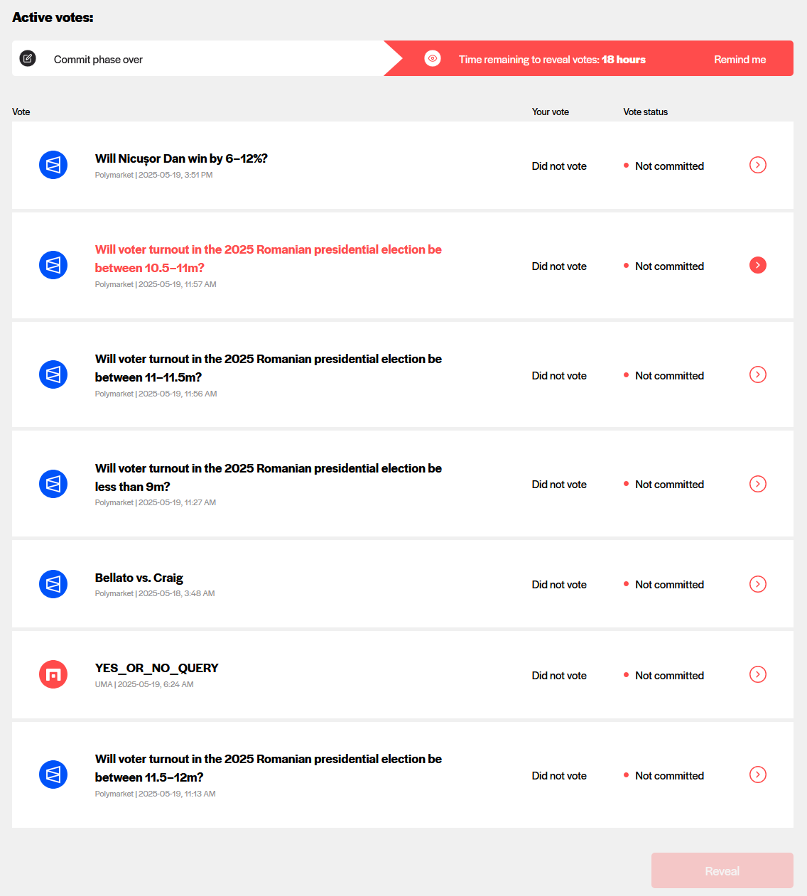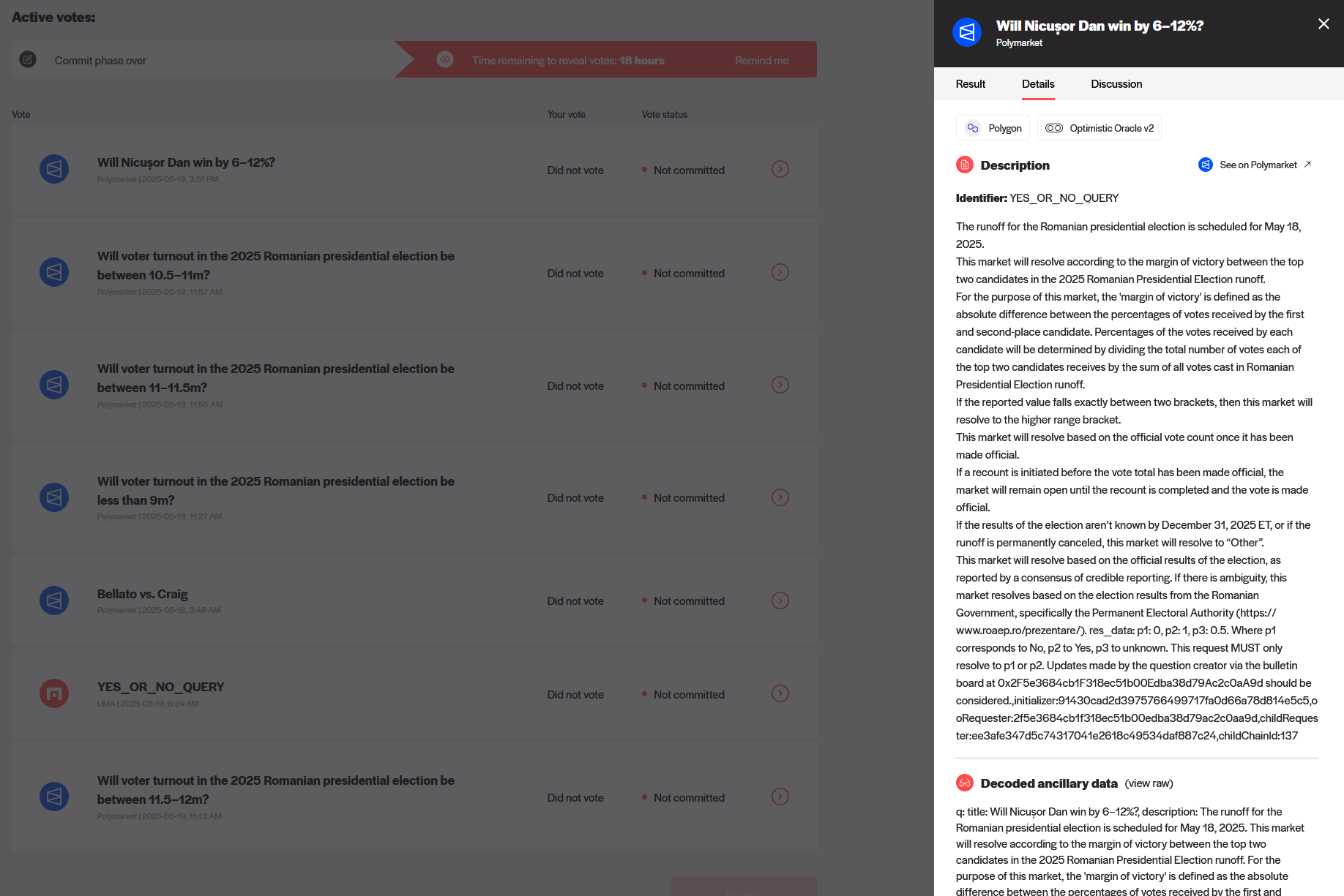 Три раунда голосования стейкеров UMA, во всех результат “Yes”.