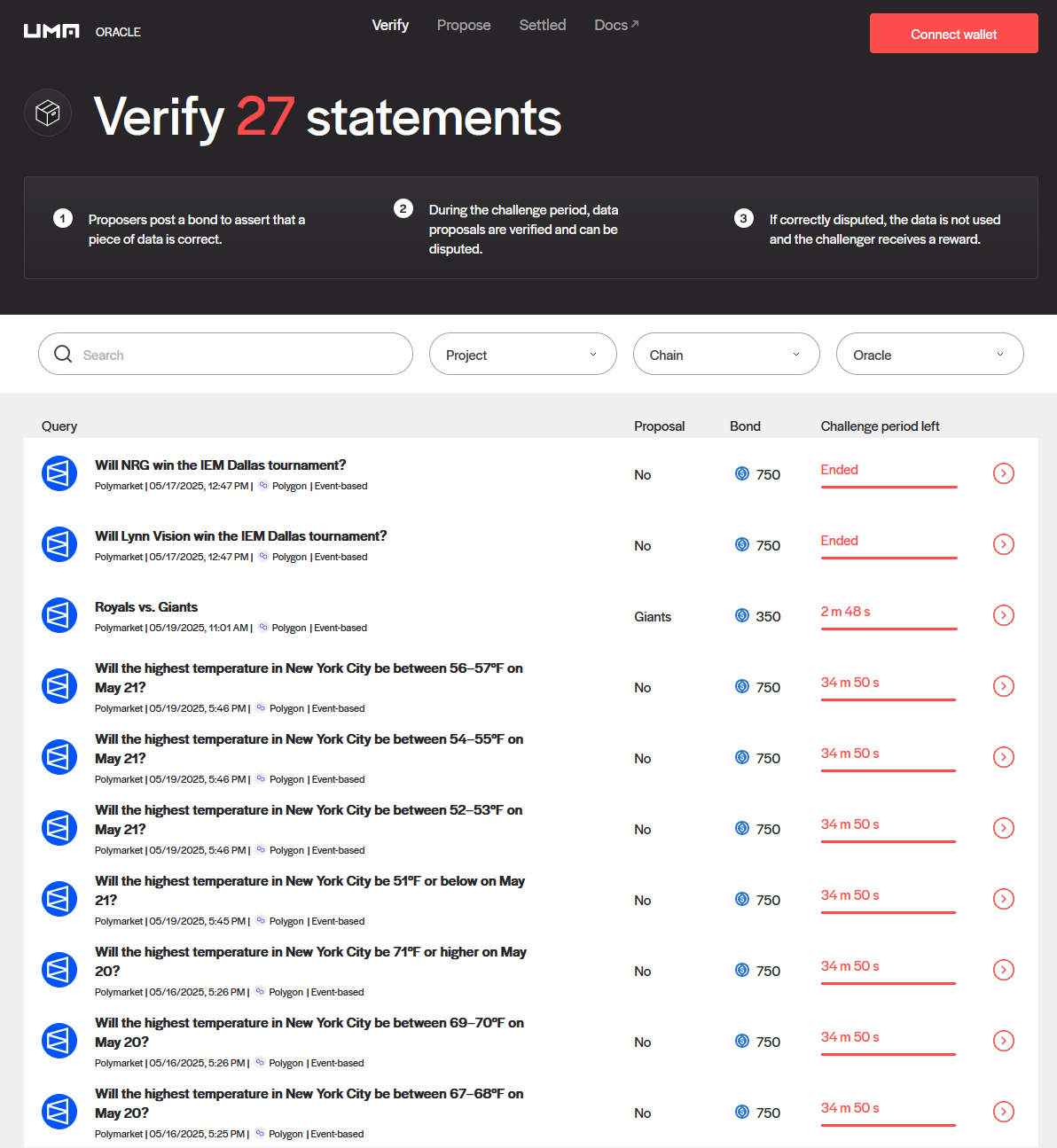 - Когда событие наступает, любой может предложить исход (propose resolution) — за это вносится залог (бонд) от 750 до до 100k USDC вместе с ответом на вопрос: “произошло ли событие X”.