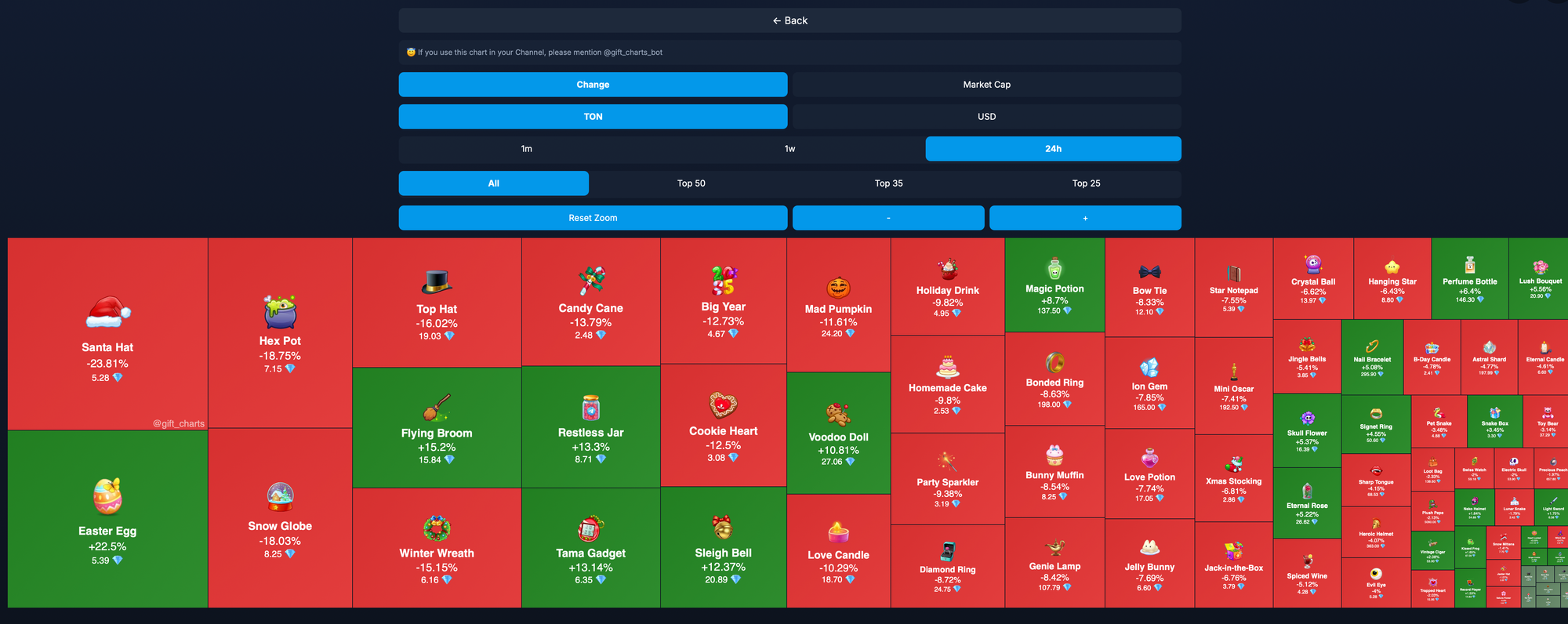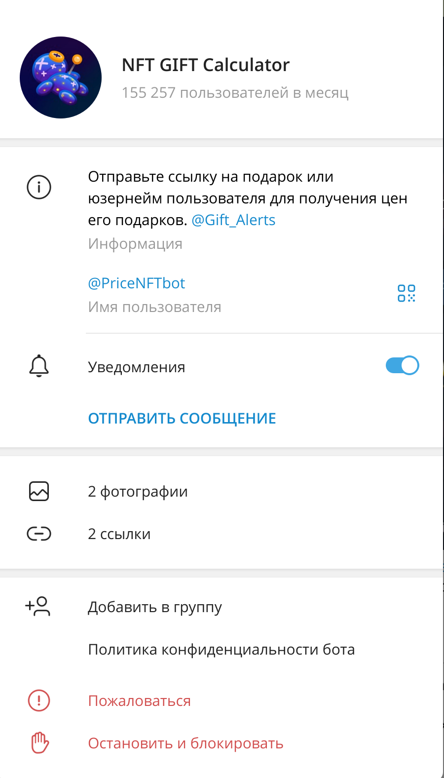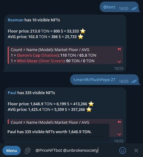 Бот позволяет посмотреть какие гифты и на какую сумму держит аккаунт по его @username или кошелек по TON-адресу.