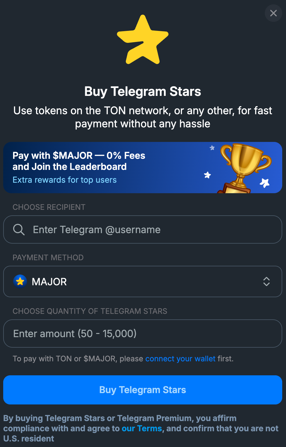 - Через Split по карте или за TON/USDT (без KYC)