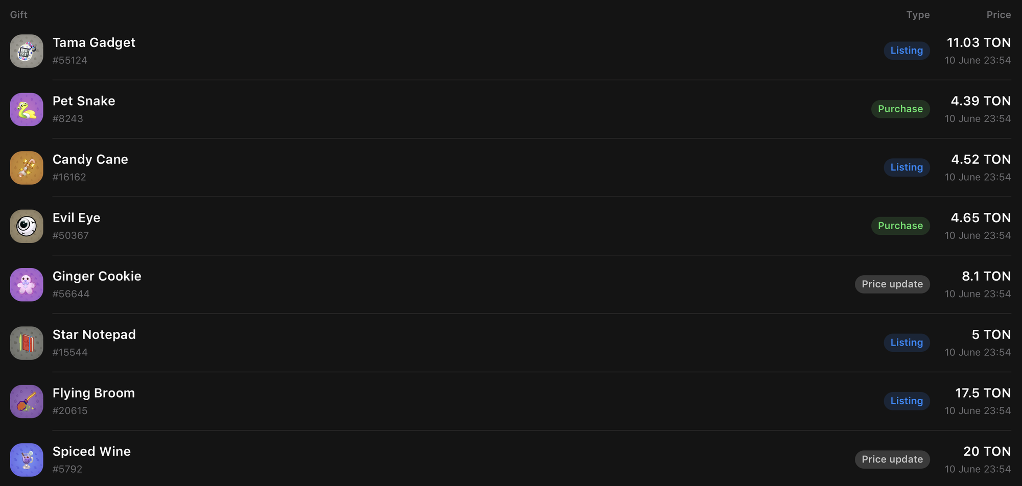 - Используйте раздел "Activity" на Tonnel, чтобы увидеть недавние сделки и по какой цене реально продавались аналогичные подарки. Это дает лучшее представление о текущем спросе и цене.