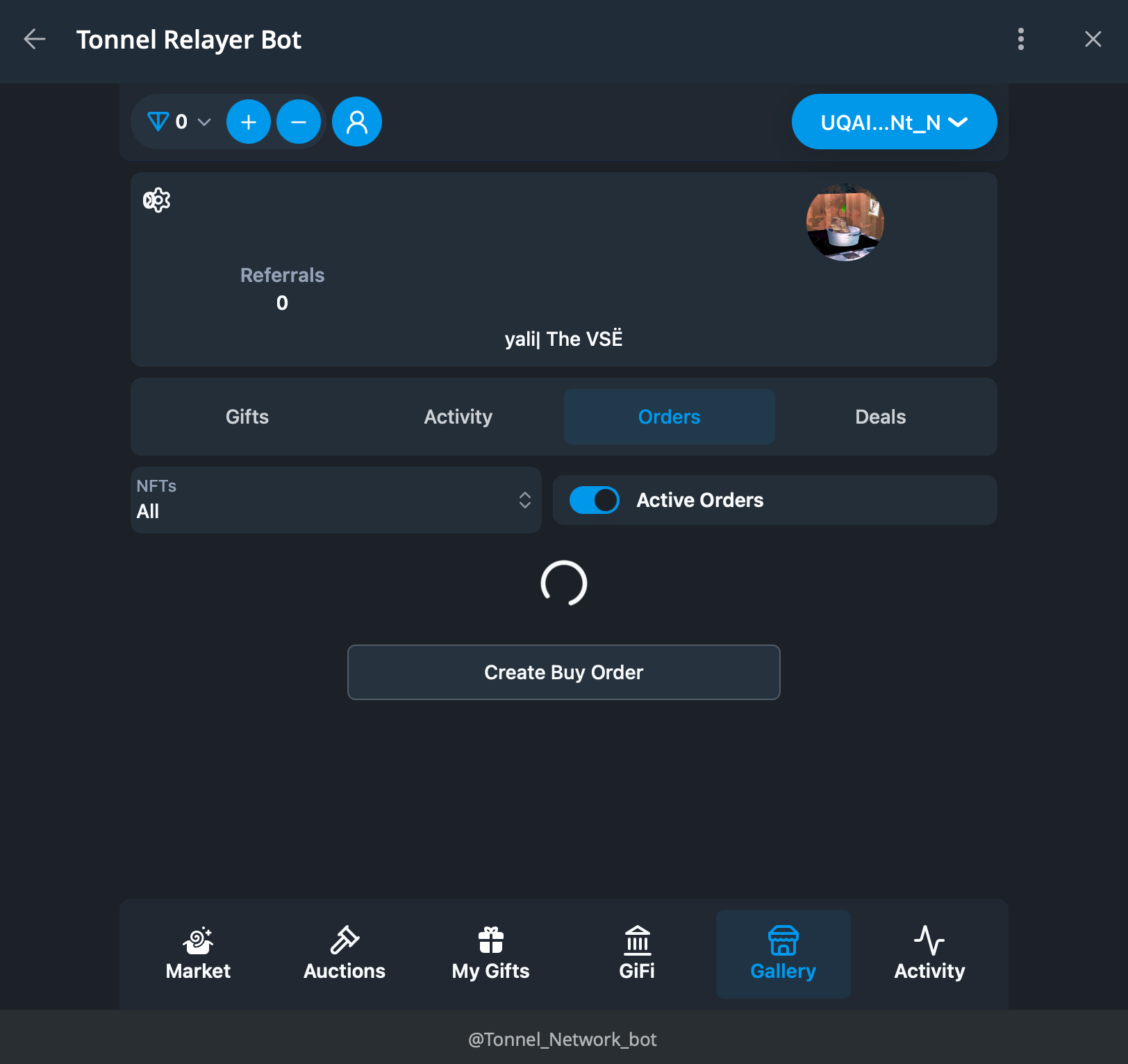 - заходим в Tonnel, далее Gallery - Orders - Create Buy Order и создаём лимитку на один из подарков с ценой ниже флора