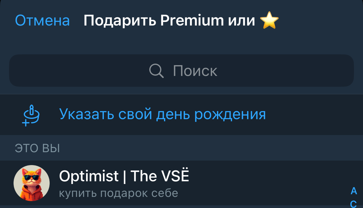 В настройках TG-профиля нажимаете на "Отправить подарок":