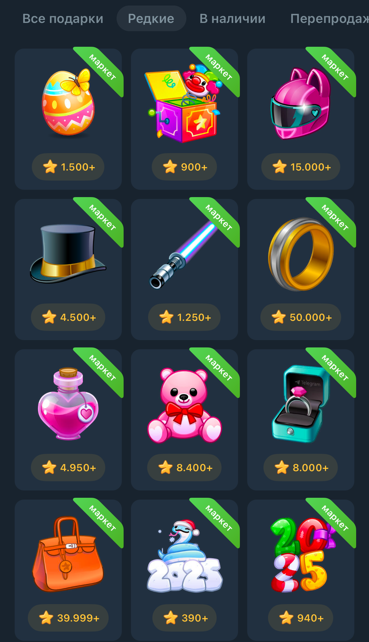 Подарки выходят в рынок через "дропы", то есть сама команда Telegram добавляет новые лимитированные подарки в приложение и они в большинстве случаев раскупаются за пару минут (в последние дни счет идет уже на секунды).