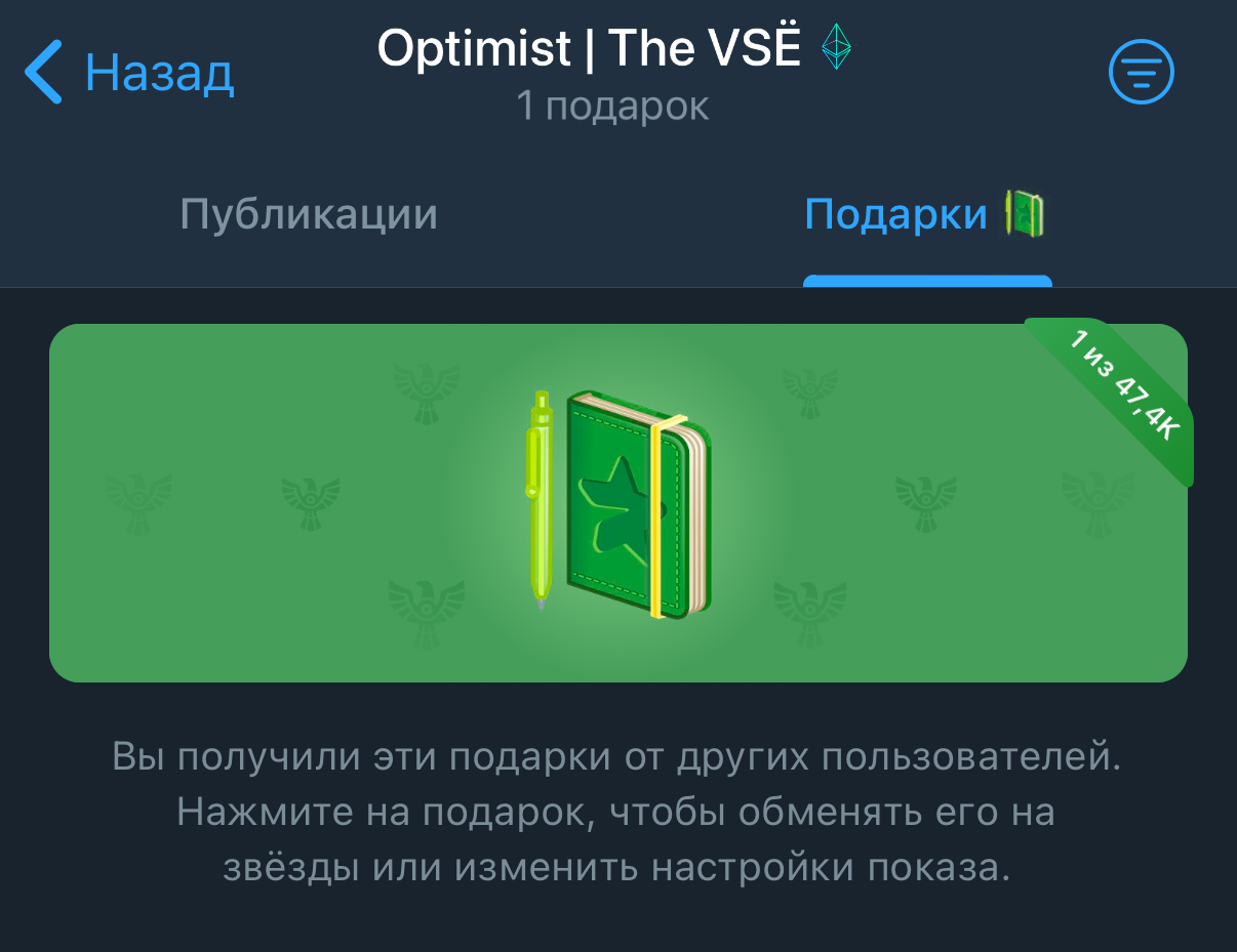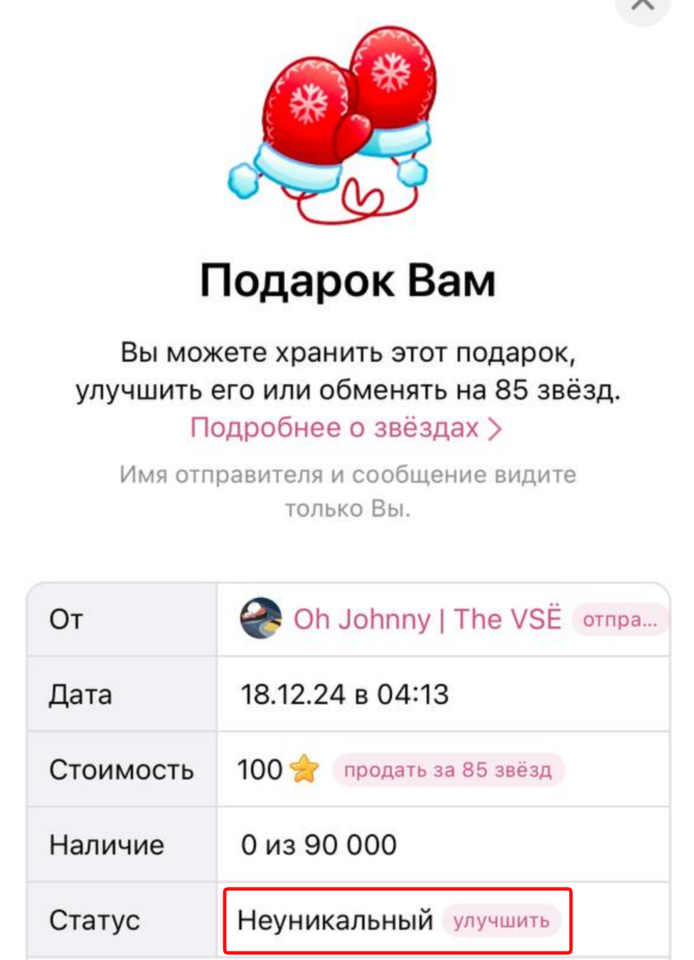 - Если получатель не обменял подарок на звезды в течение 7 дней, этот подарок навсегда останется у него в профиле без возможности его дальнейшей передачи.
