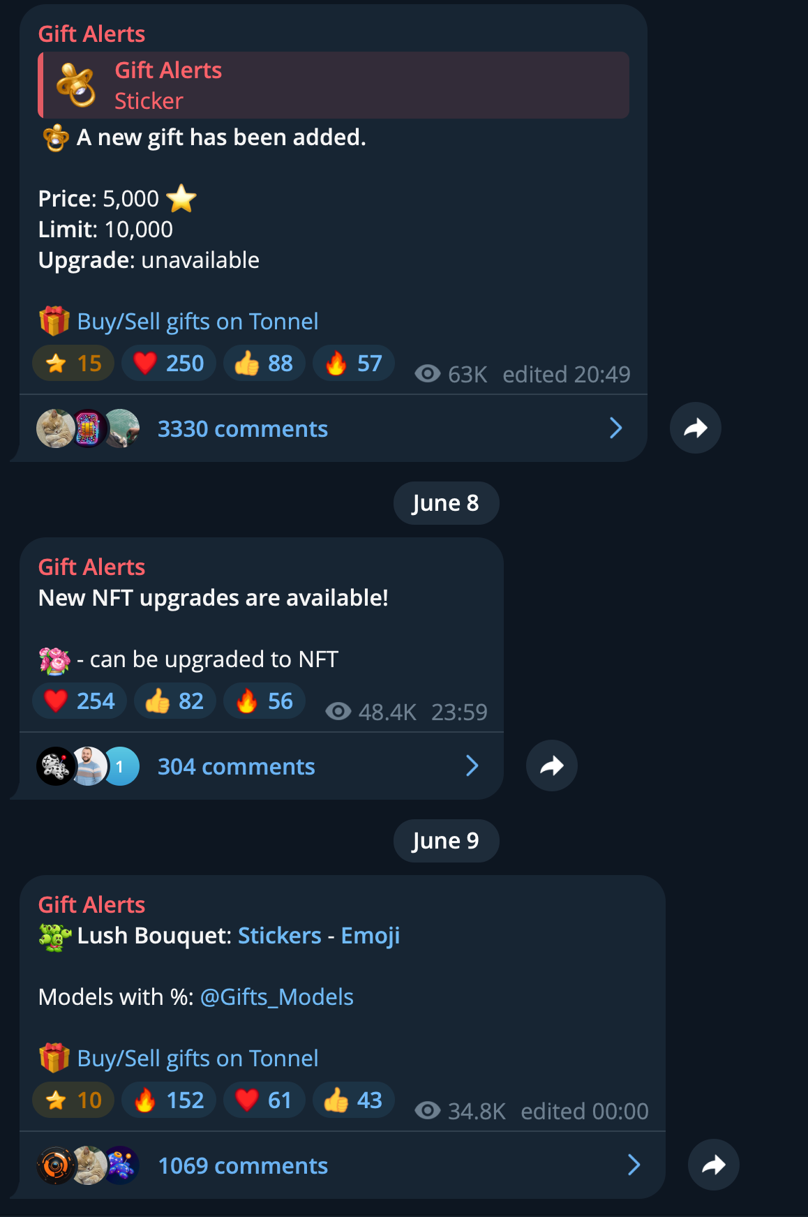 - популярность гифтов растет с каждым днем – практически каждый дроп подарков от команды TG дает хороший возврат на вложенные средства.
