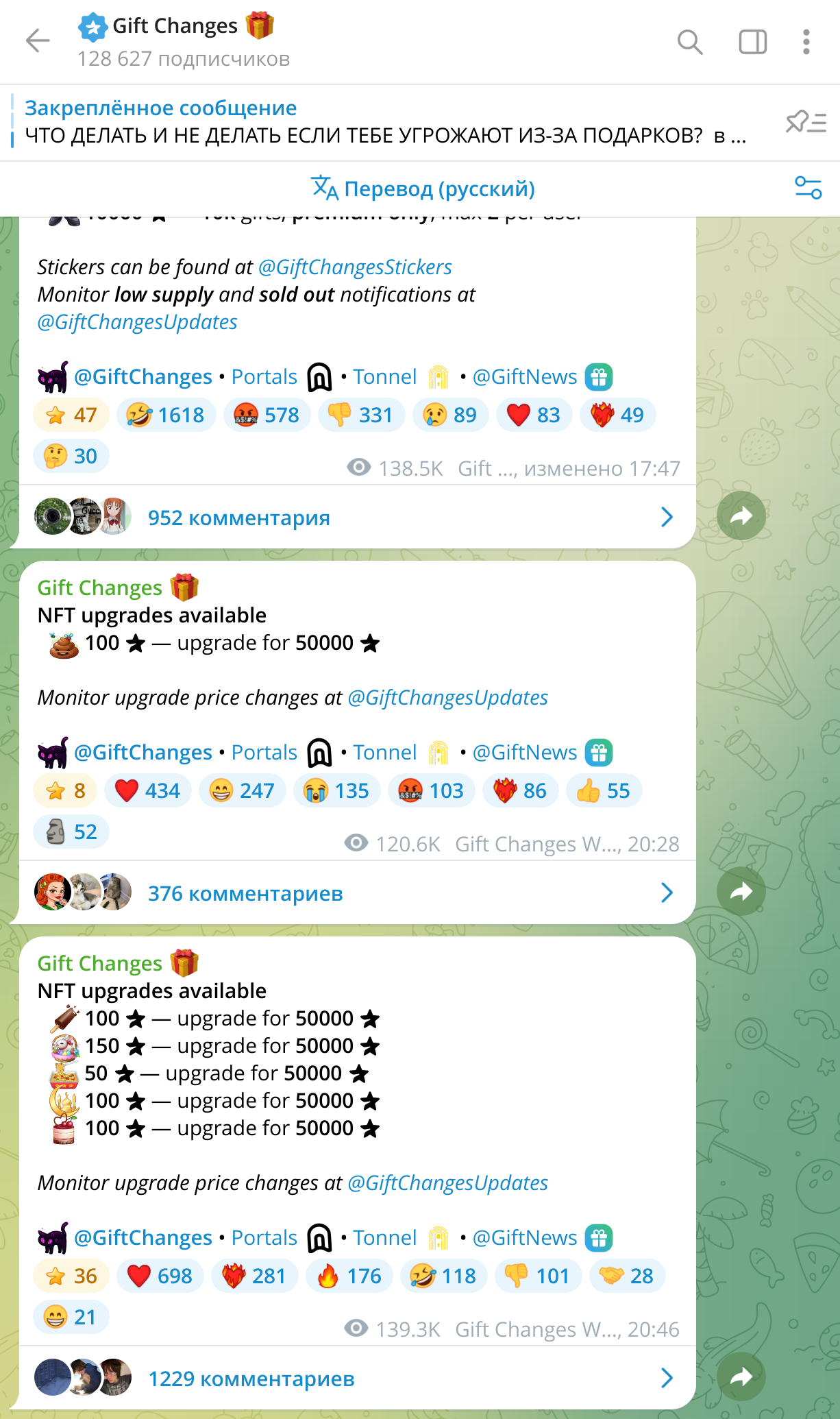 Отслеживать появление новых дропов подарков можно через различные ТГ-каналы, такие как Gifts, Gift Changes и другие, о чем мы еще поговорим ниже.