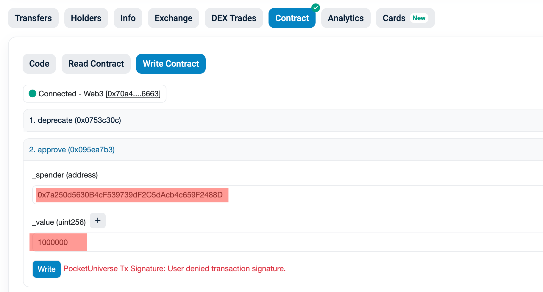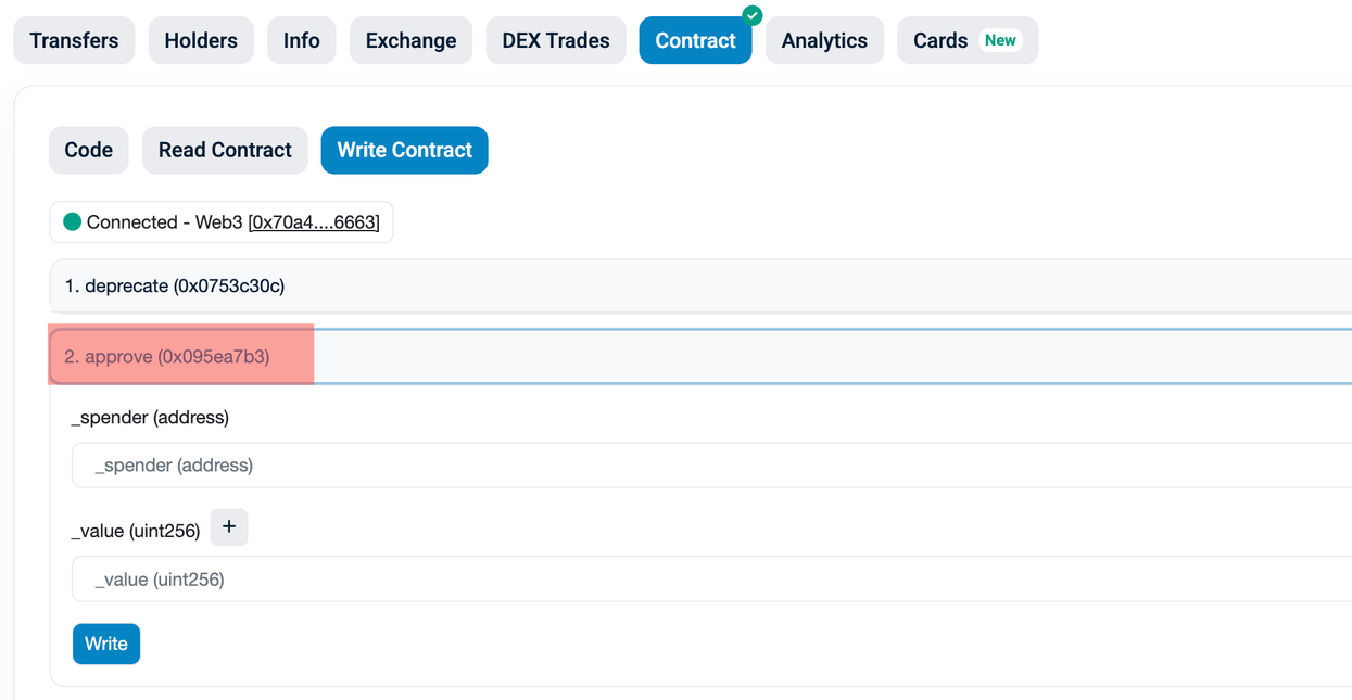 После подключения кошелька в контракте появится контекстное меню, где нас интересует пункт №2 - Approve.