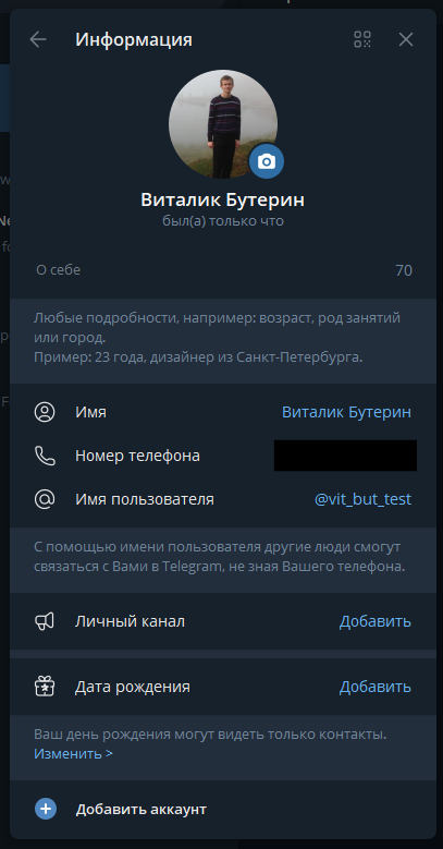 - Имя пользователя (@username): ваш уникальный публичный адрес в Telegram. По нему вас смогут найти, не зная вашего номера телефона. Выбирайте с умом.