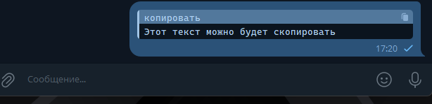 Про эту функцию мы уже упомянули выше, но давайте напомним. Если в чате или группе запрещено копировать текст, то вы можете использовать кавычки по обе стороны текста и тогда он превратится в кнопку с возможность копирования.