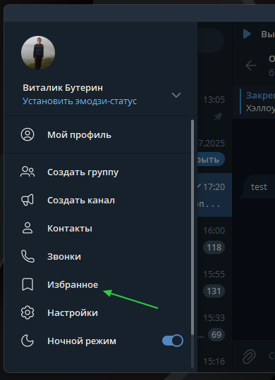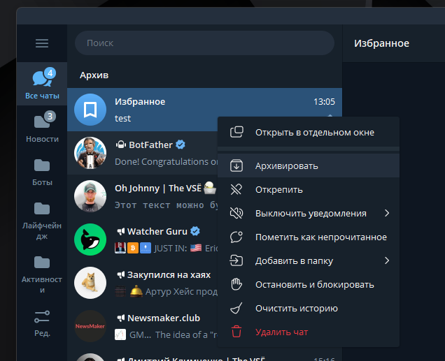 Рекомендуем сразу закрепить Избранное кликом правой кнопки мыши, чтобы не искать в списке всех каналов и чатов.
