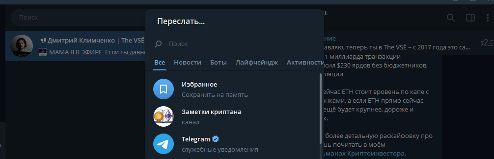 Переслать: эта функция позволяет пересылать всё содержимое сообщения целиком, разным пользователям или сохранить себе в "Избранное".