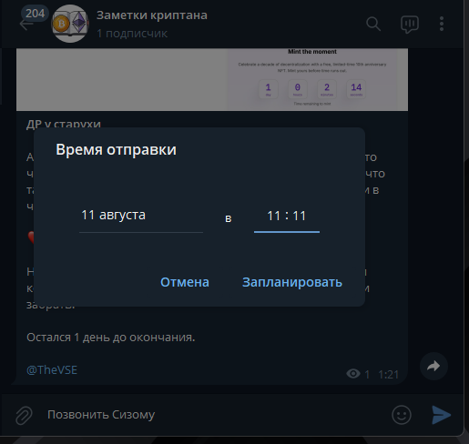 Еще есть функция отправки отложенных сообщений. Кнопка вызывается также как и в случае с без звучным режимом. Вы можете запланировать отправку на любую дату и время.