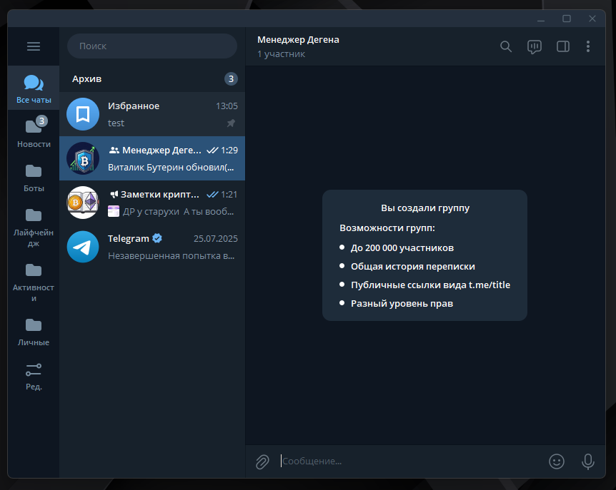 - Чаты: это привычные диалоги с одним или несколькими людьми. Еще бывают групповые чаты (или просто "группы") они могут вмещать до 200 000 участников. В чатах и происходит вся жизнь сообществ в ТГ. Это место где одновременно могут общаться и взаимодействовать сотни людей одновременно.