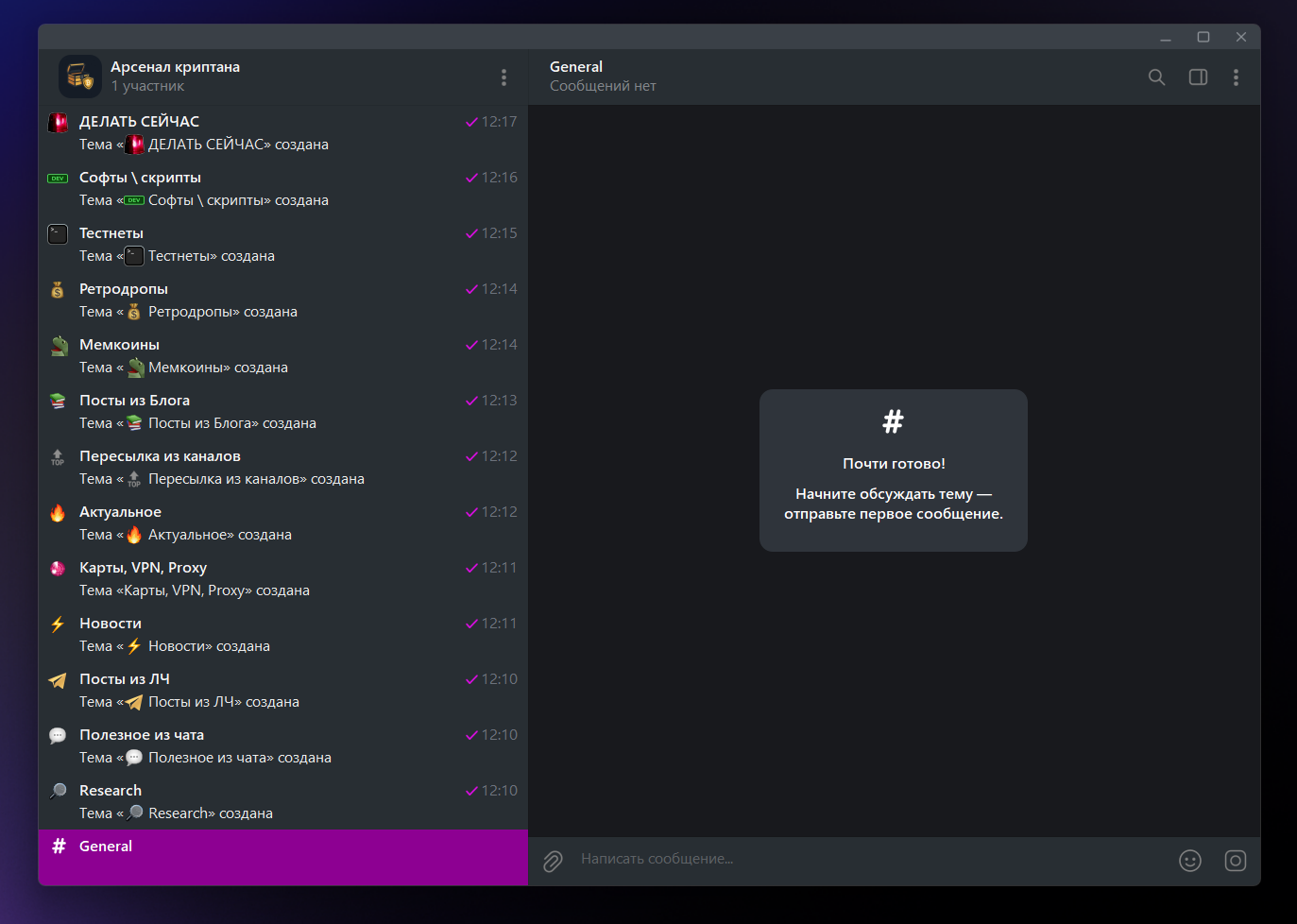 Здесь сразу хочется выделить, что у каждого пользователя есть стандартный канал для заметок и сохранения любых сообщений и файлов.