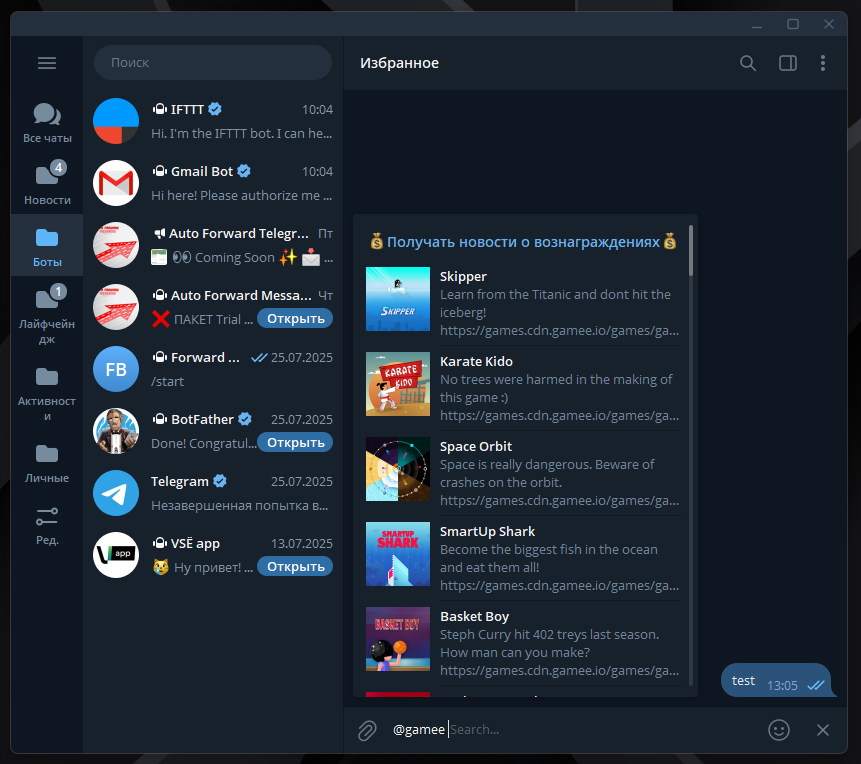 Если ввести в чат команду @gamee, а после поисковый запрос, то можно сразу выбрать мини игру и запустить не выходя из ТГ.
