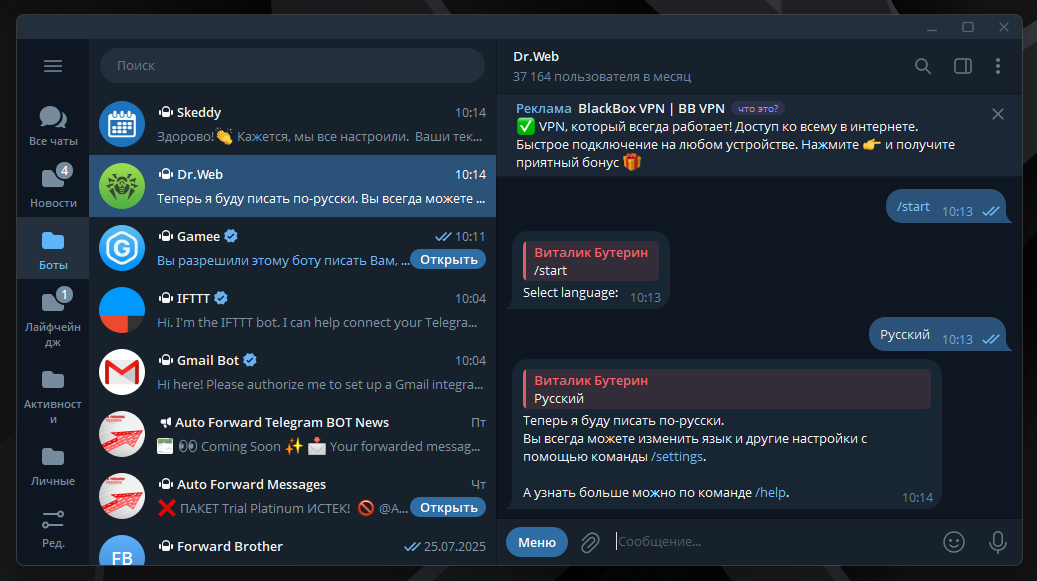 - @DrWebBot — проверяет файлы на вирусы. Просто перешлите ему файл, и он проверит его на наличие вредоносного ПО.